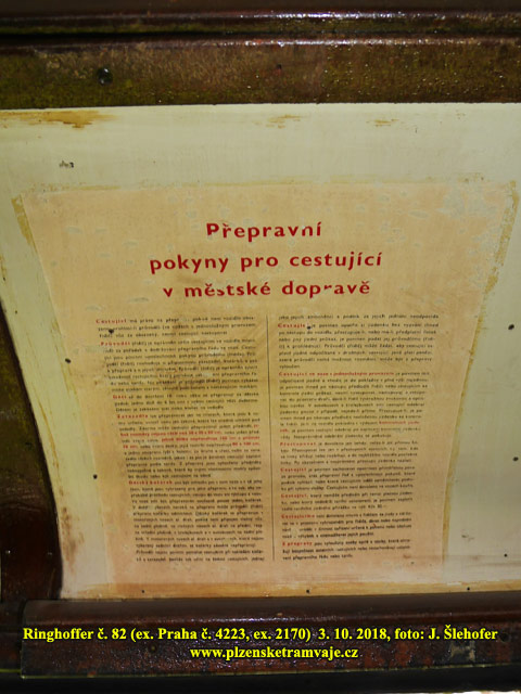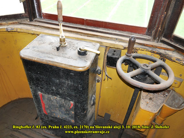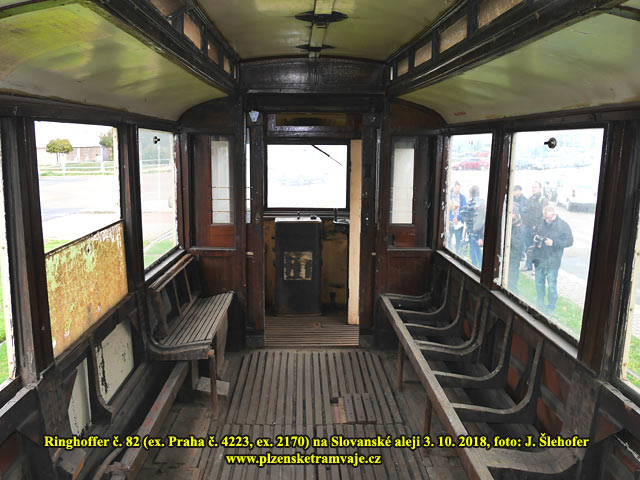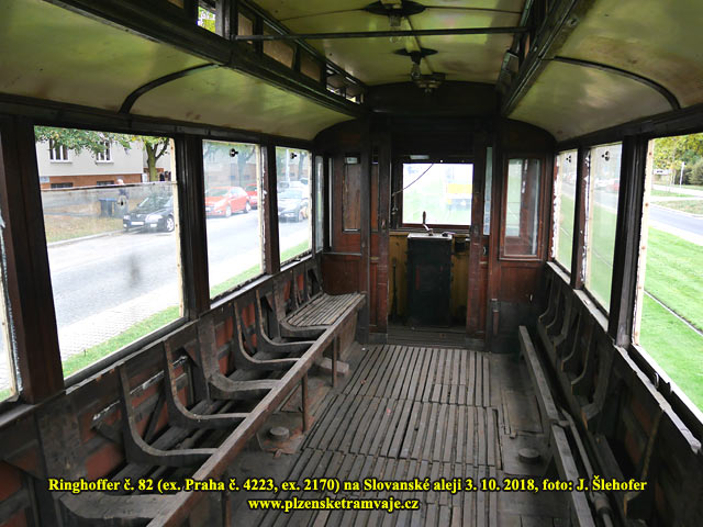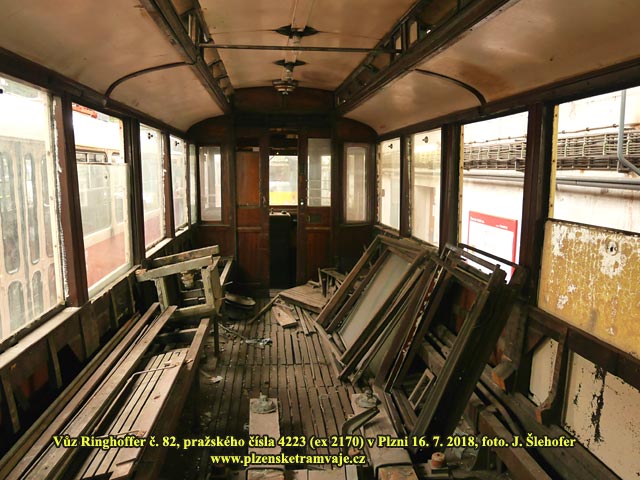 Interiér vozu Ringhoffer 82 (Praha č. 4223) po příjezdu do Plzně 16. 7. 2018 V Plzni by měl vůz obdržet číslo 82, které je v pořadí pro později z Prahy nakupované ojeté vozy podobného typu. Než se s ním však v budoucnu v Plzni svezeme, bude muset projít opravami, o jejichž rozsahu ještě nebylo rozhodnuto. Z venku vypadá vůz poměrně zachovale, ale protože v Praze sloužil jako pracovní, v interiéru bude hodně práce. Vůz také není plně provozní.