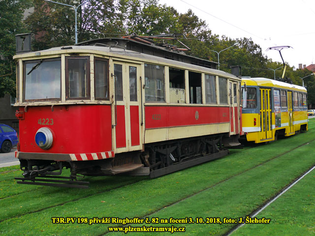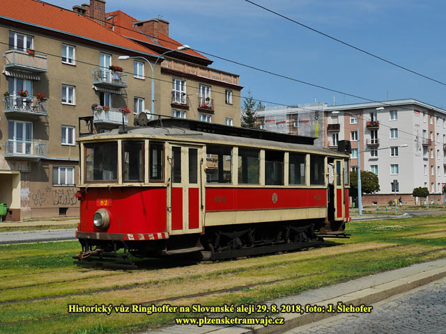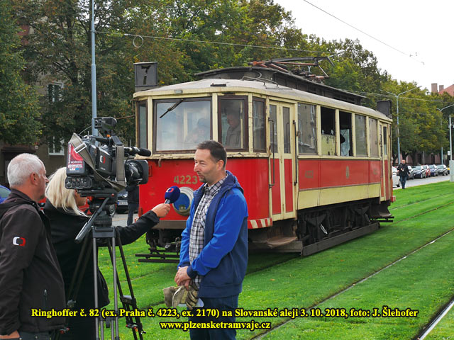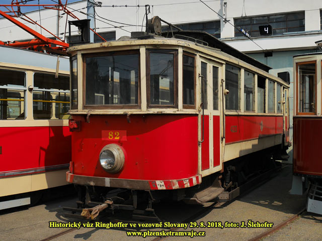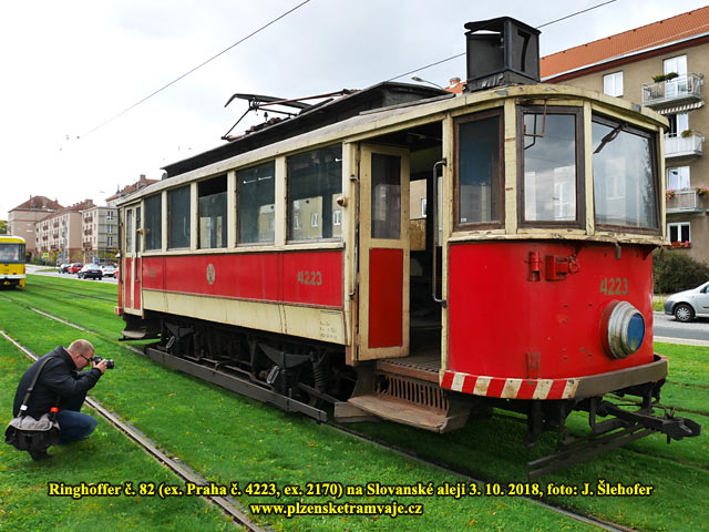 Vůz Ringhoffer 82 (Praha č. 4223) na Slovanské aleji 30. 8. 2018 Vůz Ringhoffer 82 (Praha č. 4223) ve vozovně Slovany 30. 8. 2018 Určitě však patří PMDP za nákup vozu velký dík. I já jsem si na webu často povzdechl o tom, že v Plzni chybí historický dvounápravový vůz, který by mohl při svých častějších jízdách nahradit vzácnou Křižíkovu osmnáctku.