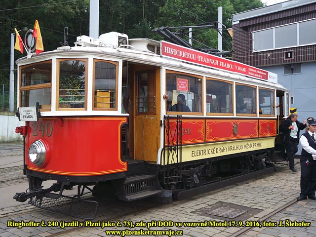 Vůz ringhoffer č. 55 na staré konečné Skvrňany, foto: J. Titz, sbírka J. Hertl Ringhoffre č. 240 jezdil v Plzni pod číslem 73, později byl zpět v Praze renovován a je zachován v Střešovckém muzeu, zde DOD ve vozovně Motol 17. 9. 2016 V roce 1929 byly do Plzně dodány první dva nové motorové vozy Ringhoffer s elektrovýzbrojí Škoda (č. 38 a 39). V následujících letech se pak objevilo v Plzni celkem dvaadvacet podobných vozů, z nichž některé byly nové, ale častěji pak spíše použité z Prahy. Nově dodávané do Plzně měly obvykle elektrovýzbroj Škoda, ojeté z Prahy pak některé výzbroj Křižík či ČKD. Do pravidelného provozu zasahovaly do roku 1962. Na snímku vpravo je pražský vůz č. 240 z roku 1908, který od roku 1952 jezdil v Plzni pod číslem 73. V provozu s cestujícími byl do roku 1959 a dále veden jako služební. V roce 1974 se vrátil zpět do Prahy, kde byl později renovován jako muzejní.