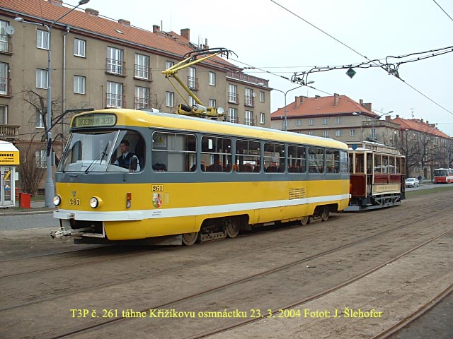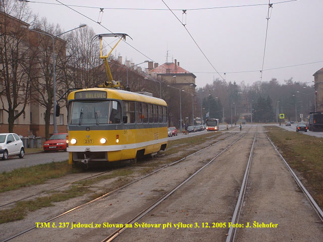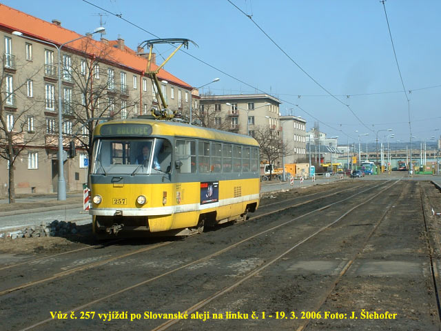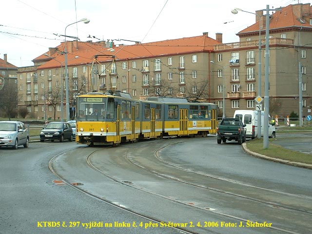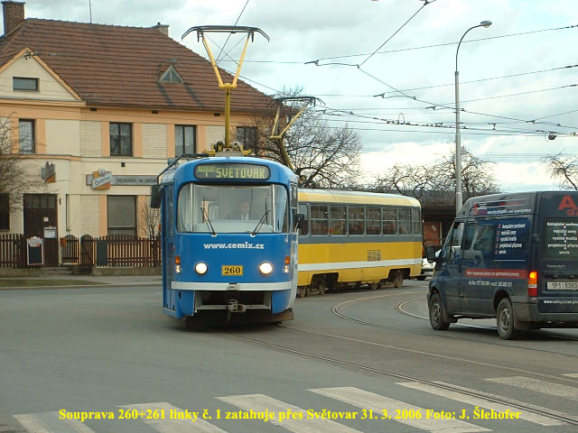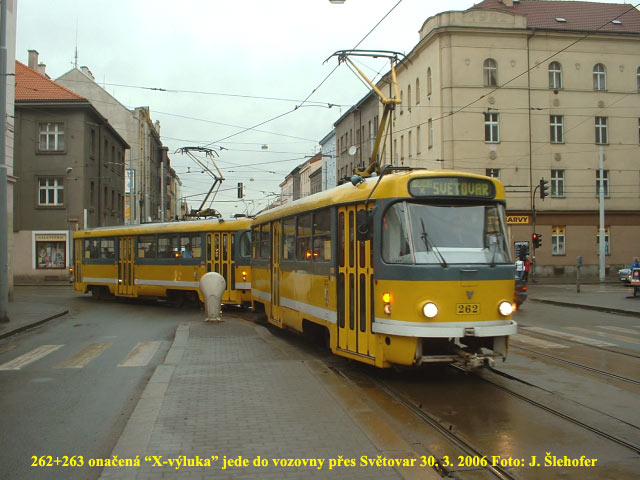 Slovanská alej po vytrhání kolejí s vyjíždějící soupravou na Světovar 31. 3. 2006 Souprava 260+261 linky č. 1 zatahuje do vozovny přes Světovar 31. 3. 2006 Vůz KT8D5 po výměně z důvodu závady vyjíždí přes Světovar na linku č. 4 dne 2. 4. 2006 Slovanská alej po vytrhání kolejí - 2. 4. 2006