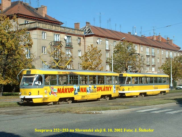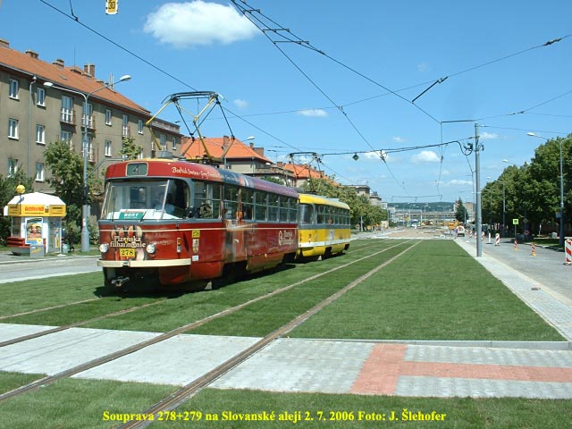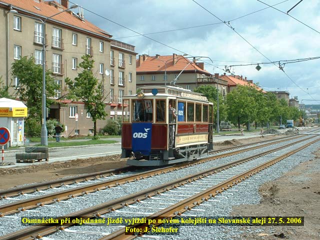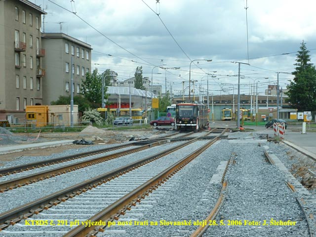 Křižíkova osmnáctka při komerční předvolební jízdě vyjíždí po nové trati na Slovanské aleji 27. 5. 2006 Souprava 233+234 linky č. 2 vyjíždí na Světovar 28. 5. 2006 Vůz KT8D5 č. 291 vyjíždí z vozovny po novém kolejišti na Slovasnké aleji 28. 5. 2006 Souprava T3M č. 209+210 vyjíždí po novém kolejišti na Slovanské aleji 28. 5. 2006