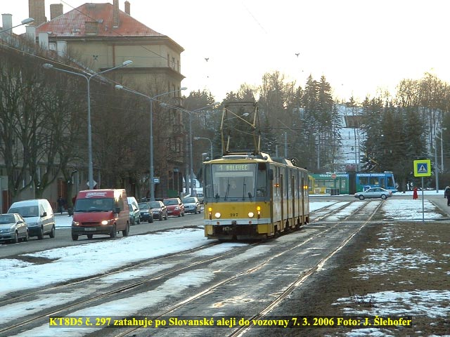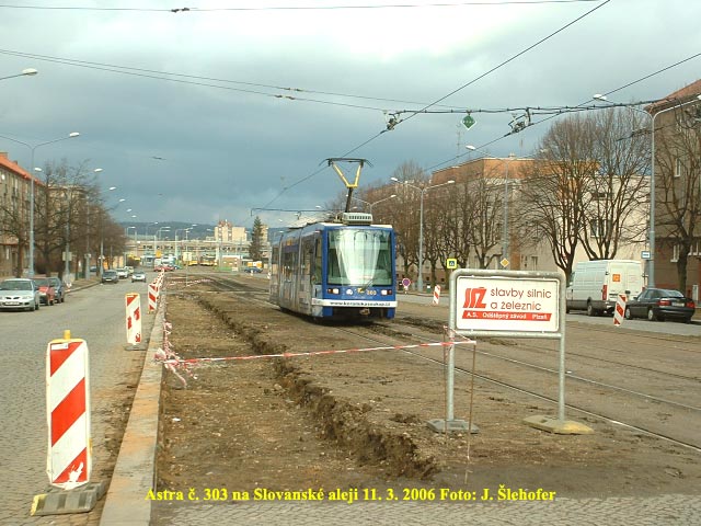 Vůz KT8D5 č. 297 na Slovanské aleji v její původní podobě krátce před jejím rozkopáním 7. 3. 2006 Astra č. 303 na Slovanské aleji krátce po zahájení rekonstrukce - 11. 3. 2006 V úterý 7. 3. 2006 byla oficiálně zahájena rekonstrukce tramvajové trati na Slovanské aleji. Celý prostor by měl být do léta změněn k nepoznání. Kolejiště bude pokryto moderním zatravněným svrškem se samozavlažováním. Na fotografii vlevo zatahuje vůz KT8D5 č. 297 do vozovny krátce před rozkopáním Slovanské aleje. Vpravo je pak situace v prvním týdnu s Astrou č. 303.