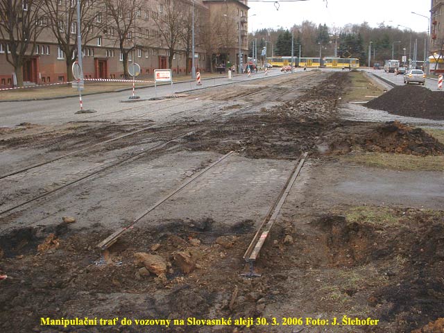 Napojení nové trati na Slovanské aleji 28. 4. 2006 Vyhybka s budoucí odbočnou kolejí směr Světovar 28. 4. 2006 Kolejové rozvětvení na Slovanské aleji - odbočka na Světovar 30. 4. 2006 Pohled od vozovny na Slovanskou alej 30. 4. 2006