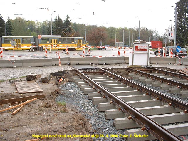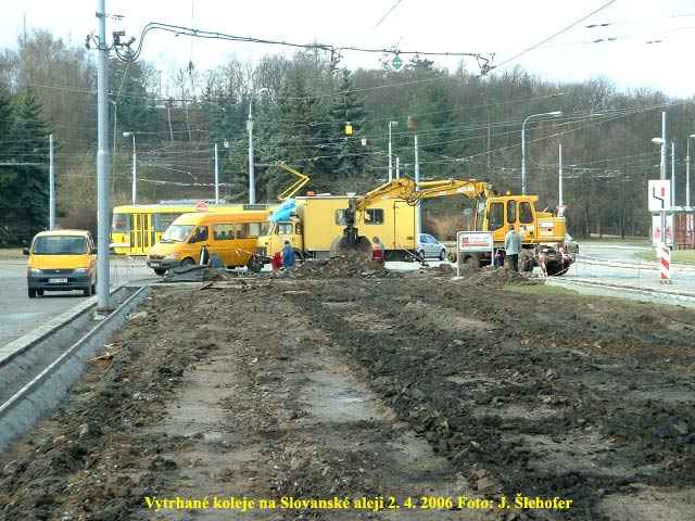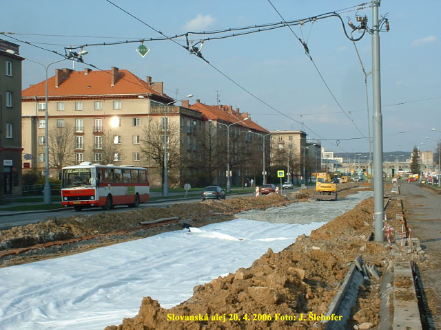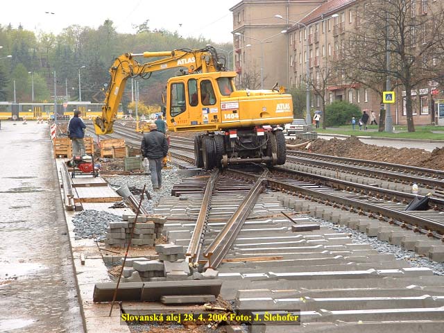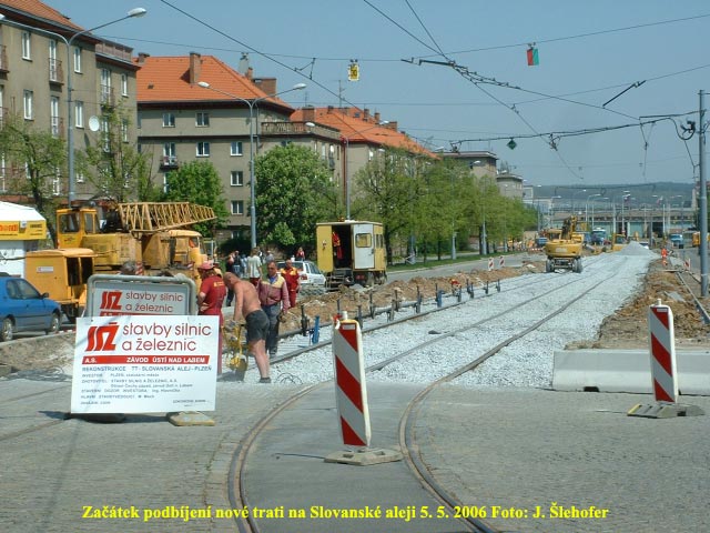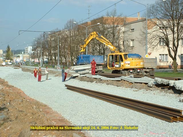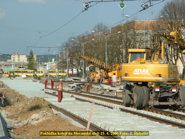 Stavba kolejiště na Slovanské aleji 25. 4. 2006 Stavba kolejiště na Slovanské aleji 25. 4. 2006 V pondělí 24. 4. 2006 se pak na místě objevily první pražce a kolejnice a od té doby roste nová trať jako z vody. Po první koleji se již v úterý prohání "bagrojeřáb" s kolejovým adaptérem a ukládá pražce pro druhou kolej. Poněkud zvláštně pak působí v budoucnu nevyužitá třetí trolej zavěšená nad staveništěm.