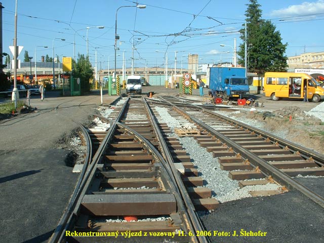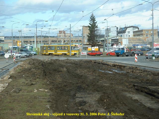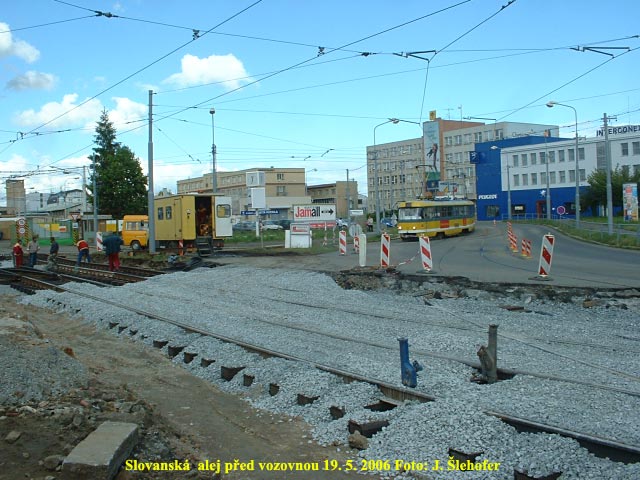 Současně pokračovaly práce i na křižovatce před vozovnou tak, že od soboty 27. 5. 2006 vyjíždí tramvaje linek č. 1 a 4 již normálně po Slovanské aleji.