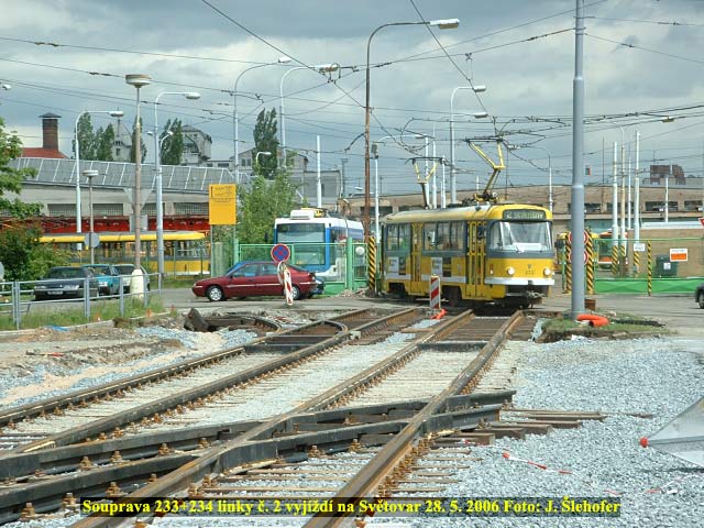 Vůz č. 293 vyjíždí po Slovanské aleji 10. 8. 2006 T3M č. 213+214 vyjíždí z vozovny na linku č. 2 - 10. 8. 2006 Poslední dokončovací práce probíhají v první polovině srpna. Na fotografiích zachycujích výjezd šejdrů dne 10. 8. 2006 je patrný i již dokončený výjezd směr Světovar.