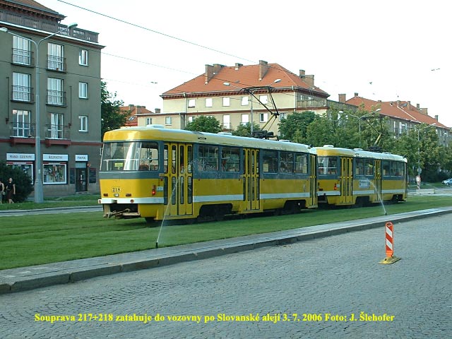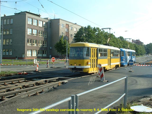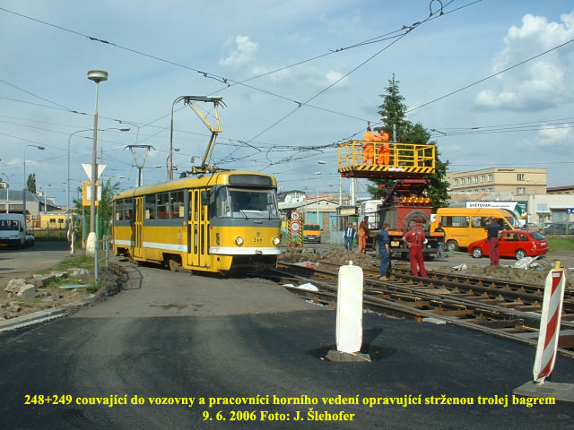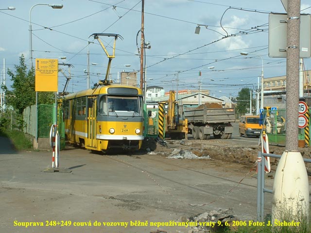 Souprava 248+249 zatahující couváním do vozovny běžně nepoužívanými vraty a vedle pracovníci horního vedení opravující trolej strženou bagrem 9. 6. 2006 Souprava 260+261 couvá ze Slovan do vozovny 9. 6. 2006 KT8D5 č. 296 jedoucí do vozovny ze Slovan po protisměrné koleji 9. 6. 2006 Rekonstruovaný výjezd z vozovny - 11 6. 2006