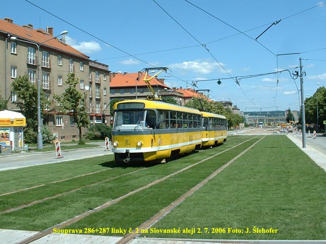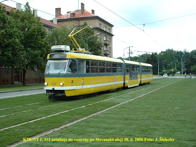Vůz K3R-NT č. 312 zatahuje po Slovanské aleji do vozovny 30. 6. 2006 Slovanská alej se zatravěným kolejištěm 1. 7. 2006. Za povšimnutí stojí i třetí trolej nad trávníkem :o) Koncem června byl v první části Slovanské aleje instalován zatravněný svršek. Trávníkový koberec byl složen z dovezených předpěstěných drnů. Kolejiště je tak esteticky velmi pěkné a pozvedne celou podobu Slovanské aleje. Jak je patrné z fotografií je v provozu již i automatické zavlažování.
