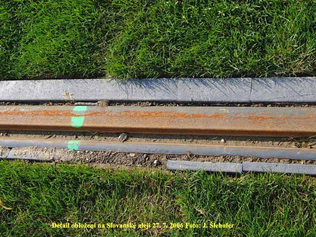Souprava 196+198 zatahuje po Slovanské aleji do vozovny 25. 7. 2006 Hlína mezi protihlukovou bočnicí a kolejnicí je na mnohých místech Slovanské aleje 25. 7. 2006 Trávník s automatickým zavlažováním je již položen v celé délce Slovanské aleje. Ta tak vypadá z estetického hlediska velmi pěkně. Bohužel není všechno zlato co se třpytí. Prohlédneme-li si detailně protihlukového obložení kolejnic v rovných úsecích, kde nebylo lepené, zjistíme, že na některých místech je zemina i mezi kolejnicí a bokovnicemi obložení. Pak bohužel obložení nebude mít takový účinek, jaký by mělo mít. ÿP>