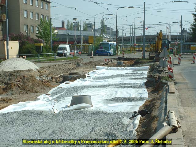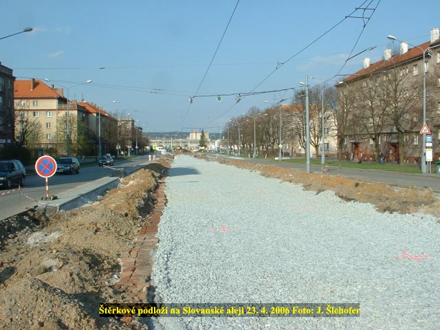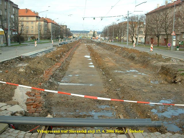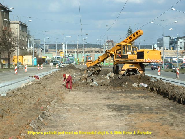 Příprava podloží pro nové koljiště na Slovanské aleji 6. 4. 2006 Vybagrované kolejiště s udusaným podložím na Slovanské aleji 17. 4. 2006 První dubnový týden bylo podloží tramvajové trati na Slovanské aleji důkladně vybagrováno a po té na chvíli stavební ruch zdánlivě ustal. Pouze se zde objevily nové úzké dělící ostrůvky (chodníčky pro fotografy), mezi vozovkou a budoucím trávníkem. Menší zdržení patrně zapříčinily napájecí kabely.