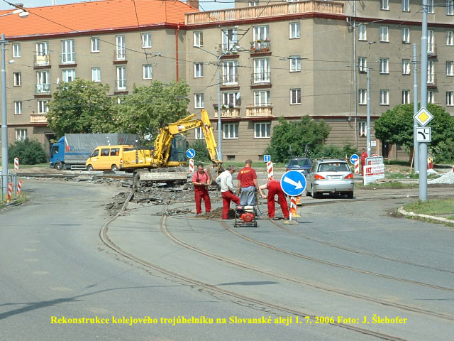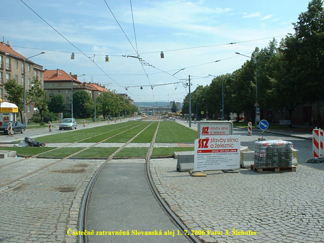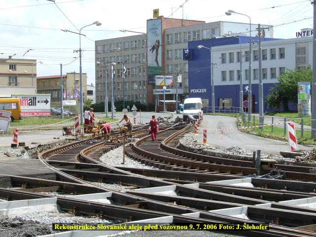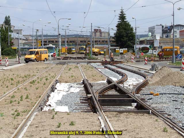 Rekonstrukce kolejového trojúhelníku před vozovnou - trať ve směru Slovany - Světovar 9. 7. 2006 Slovanská alej - vyhybka odbočující koleje od Slovan na Světovar 9. 7. 2006 Jak ukazují tyto dvě fotografie, ještě stále není celá Slovanská alej hotova, jak by se mohlo zdát z horních snímků. Zbývá zrekonstruovat oblouk od Světovaru do vozovny, dokončit zatravněný svršek na trati z vozovny na Slovany a později přijde na řadu také rekonstrukce vozovek.