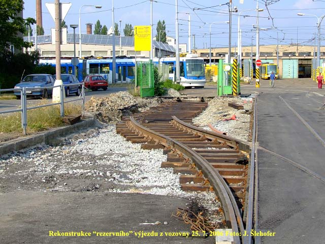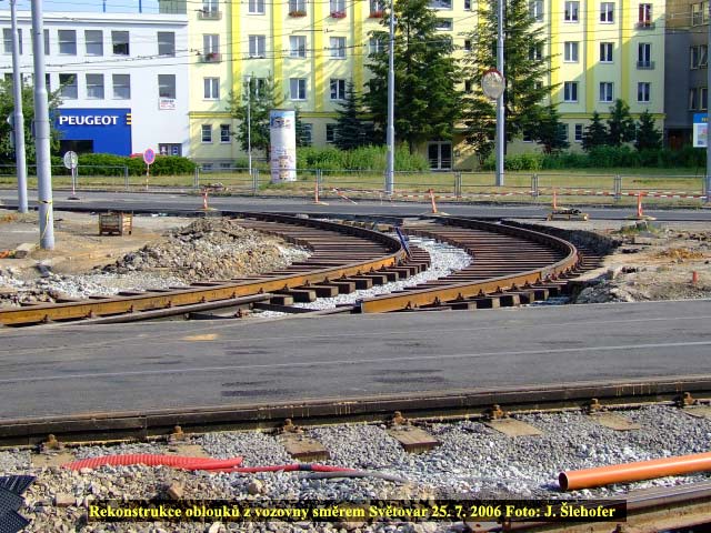 Rekonstrukce nepoužívaného výjezdu z vozovny (odstavné koleje pro Vektru) 25. 7. 2006 Oblouky z vozovny na Světovar 25. 7. 2006 Koncem července je již dokončeno kolejiště v křižovatce před vozovnou i ve směru Slovany - Světovar. Vyjímkou jsou už jen oblouky vozovna Světovar, na kterých se ještě pracuje. Rovněž se ještě pracuje na nepoužívaném výjezdu z vozovny.