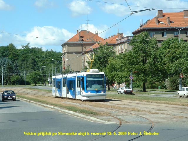 Vektra přijíždí po Slovanské aleji k vozovně 18. 6. 2005 Souprava T3M 219+220 vyjíždějící z vozovny na odpolední špičku spolu s autobusy linky č. 30 na Slovanské alejileji 18. 11. 2005 Na následujích fotografiích je zachycena Slovanská alej jak vypadala dosud. I nyní zde byla podivná varianta zatravněného svršku, či spíše udusané hlíny. Po manipulační trati k vozovně se čas od času mohli při výlukách svézt i cestující. Naposledy tomu bylo 3. 12. 2005.