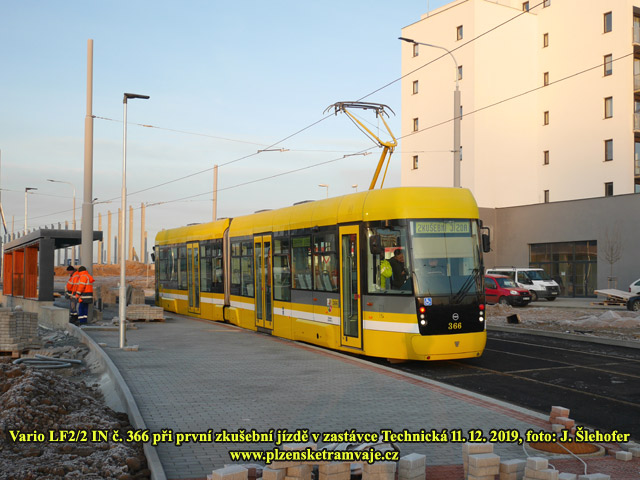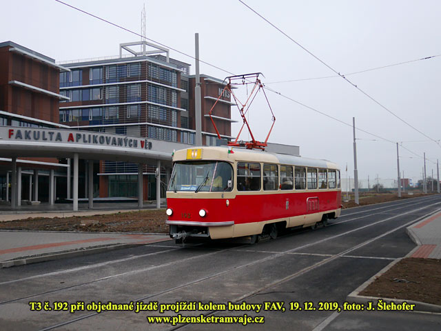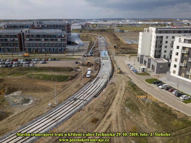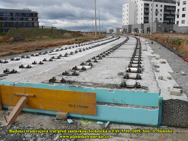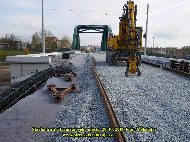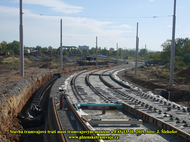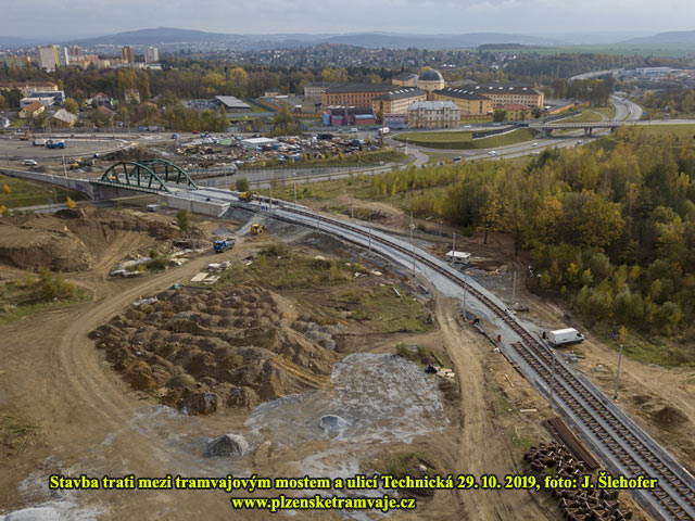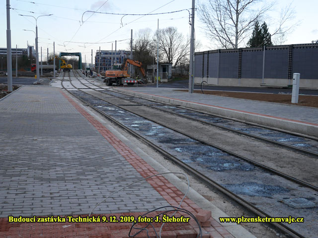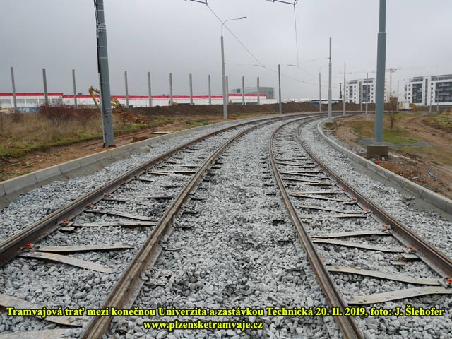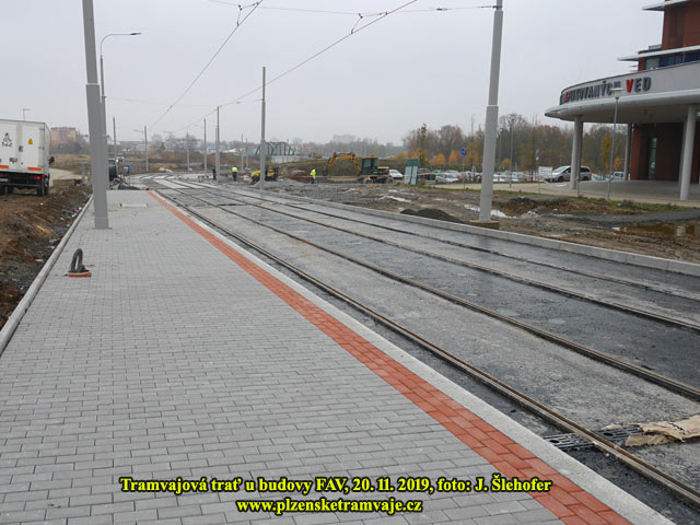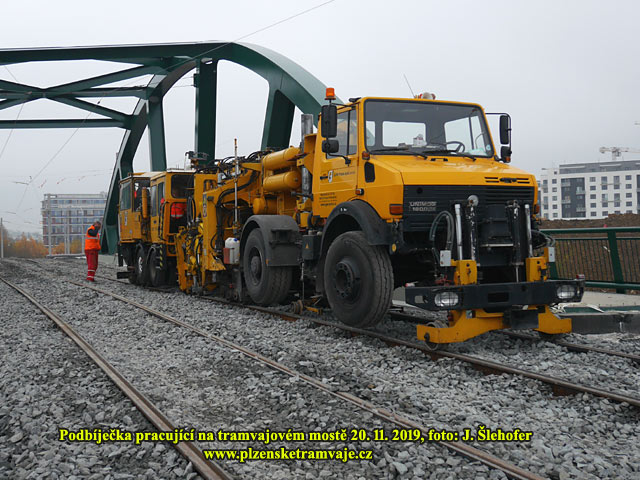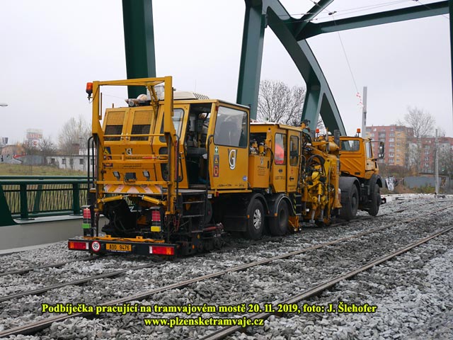 20. 11. 2019 20. 11. 2019 Od pondělí 18. 11. 2019 pracuje na trati přibližně týden dvoucestná podbíječka UST 78 U. Podbíjí koleje s ypsilonovými pražci. Na snímcích z 20. 11. 2019 je zachycena na tramvajovém mostě. Před budovou FAV byly vybudovány nástupiště zastávky Technická a křížení tramvajové trati se stejnojmennou ulicí.