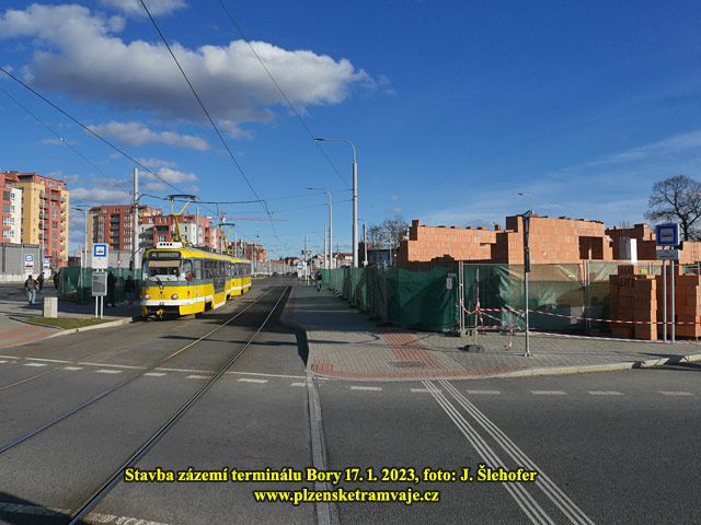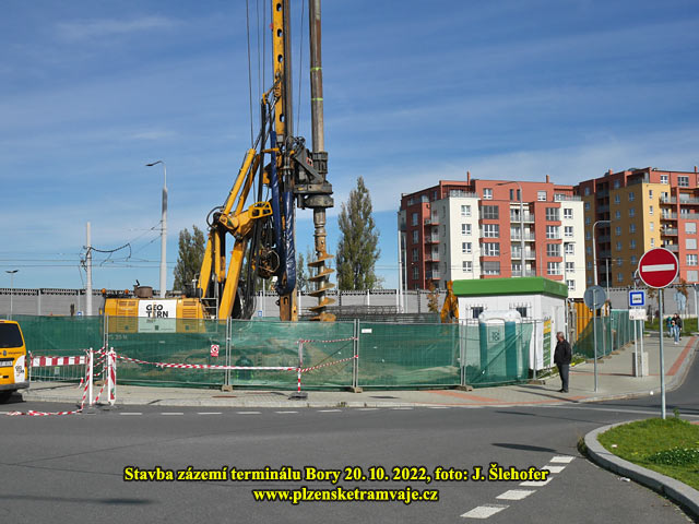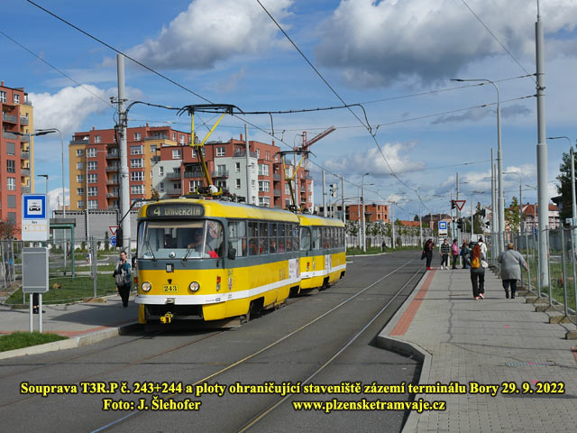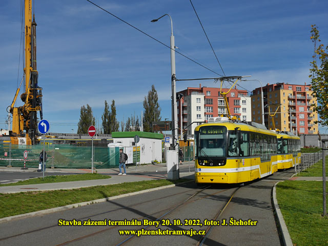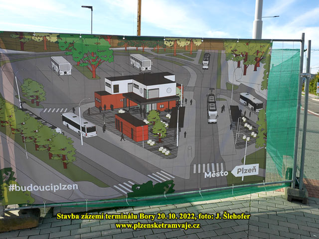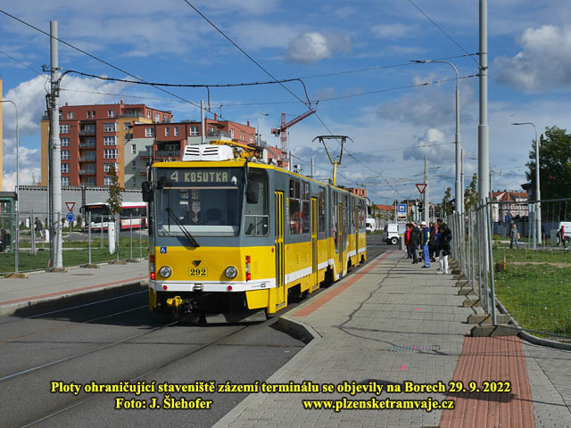 Ploty naznačující zahájení stavby na terminálu Bory a KT8D5-RN2P č. 292 - 29. 9. 2022 T3R.P č. 243+244 na Borech 29. 9. 2022 Začátkem roku 2022 se v tisku objevily informace o stavbě zázemí terminálu Bory se zahájením v červnu 2022. Celé léto se však nic neděje, až konečně koncem září se na místě objevují ploty, které signalizují začátek stavby.