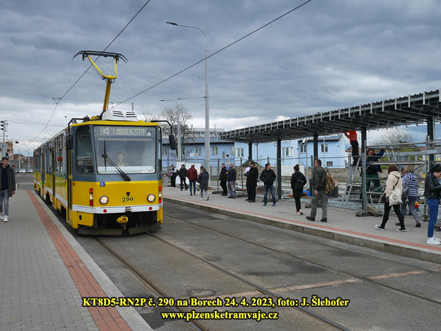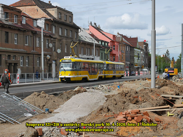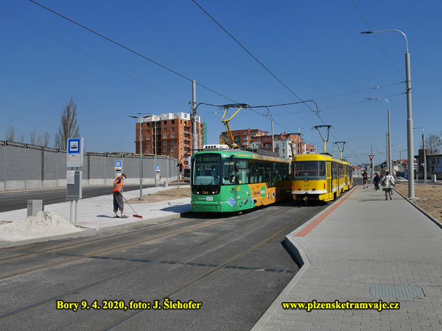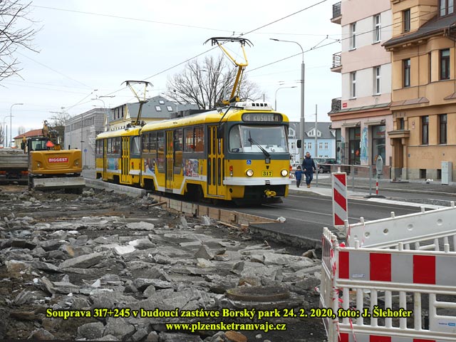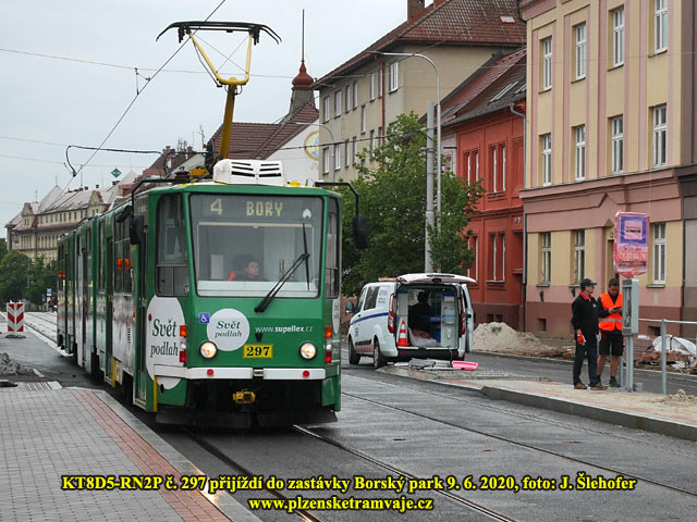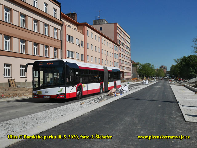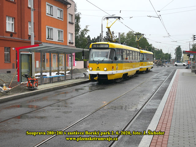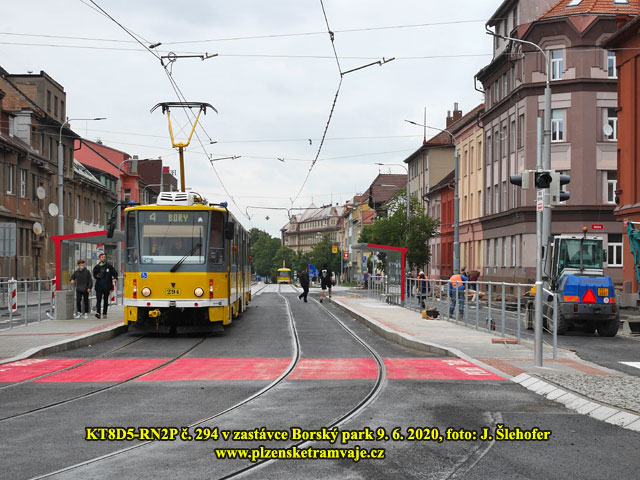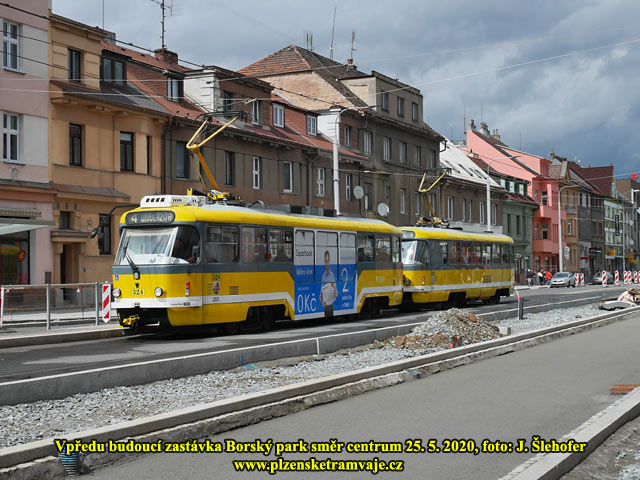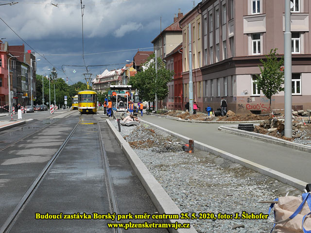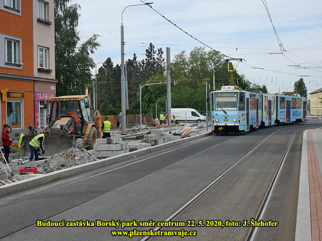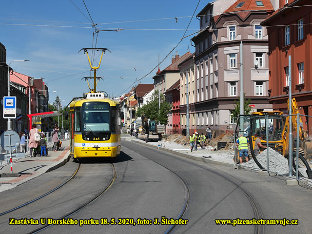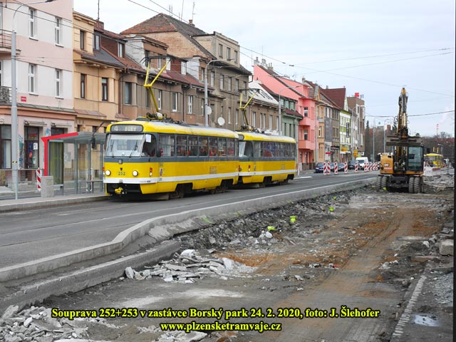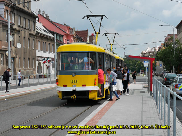 Souprava 252+253 odbavuje v nové zastávce Borský park 16. 6. 2020 Zastávka Borský park ve směru do centra je obsluhována od soboty 13. 6. 2020. Od stejného dne je také otevřena křižovatka Klatovská - Kaplířova - U Borského parku pro veškerou dopravu, kde je již funkční světelná signalizace.