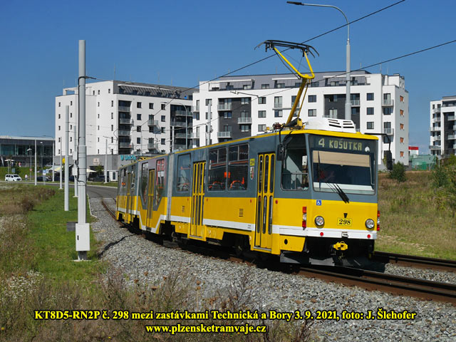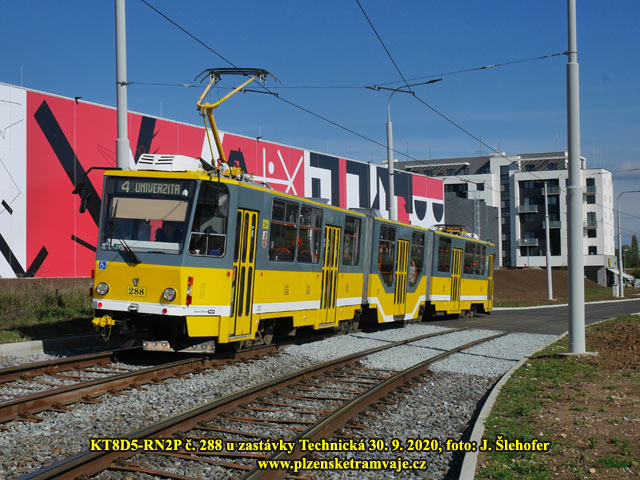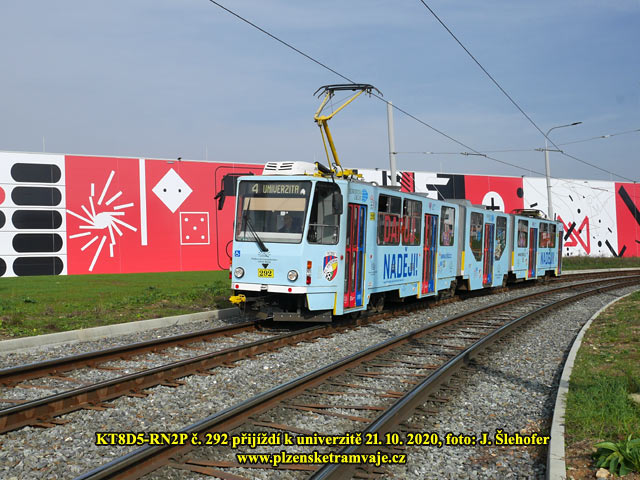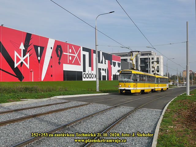 Souprava 252+253 u zastávky Technická 21. 10. 2020 KT8D5-RN2P č. 292 přijíždí k univerzitě 21. 10. 2020 Na co však bohužel stále nedošlo, je nějaké vzhledná úprava trávníků. V ostrůvcích kolem vozovek i v okolí trati je všude jen náletová zeleň, v zadní části trati k univerzitě ani často zemina není pěkně upravená k obrubníkům. Příkladným je tak pouze nový trávník jiného investora u později postavené nové haly vedle trati u zastávky Technická.