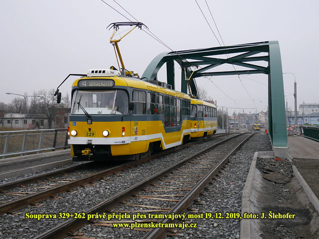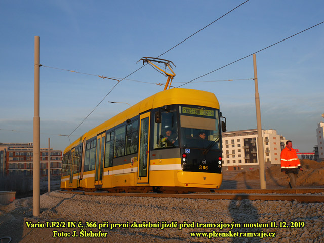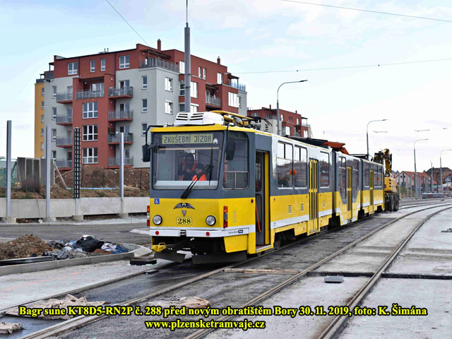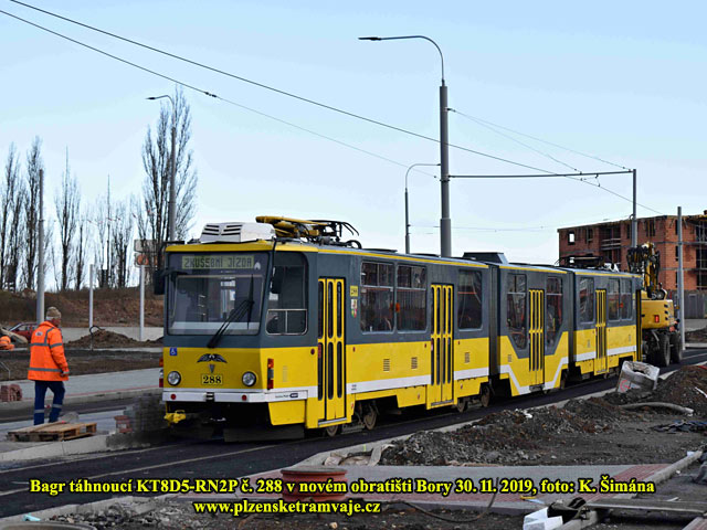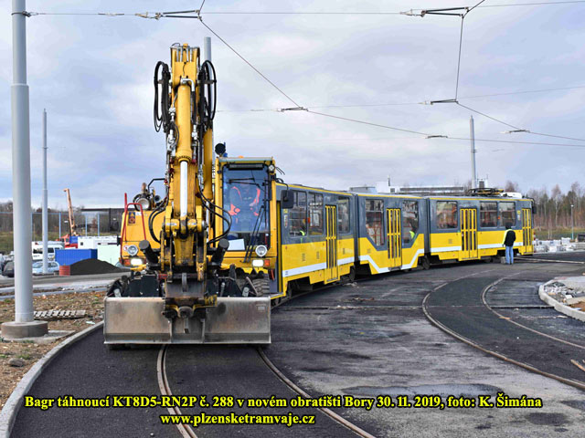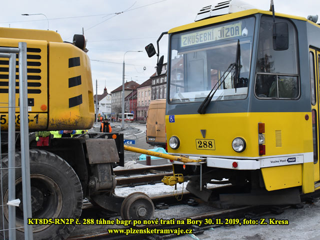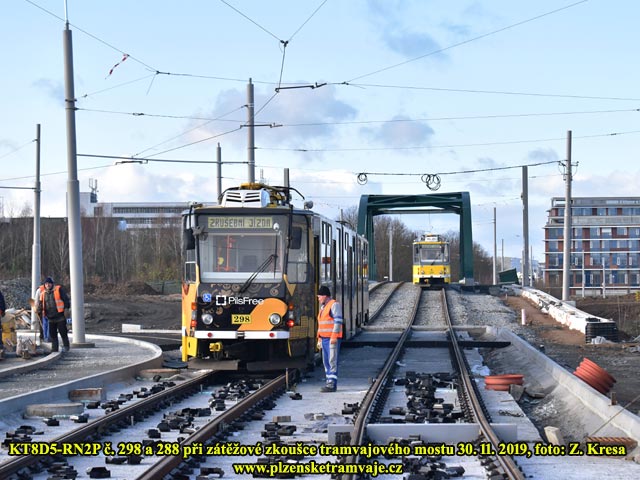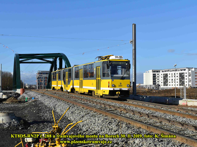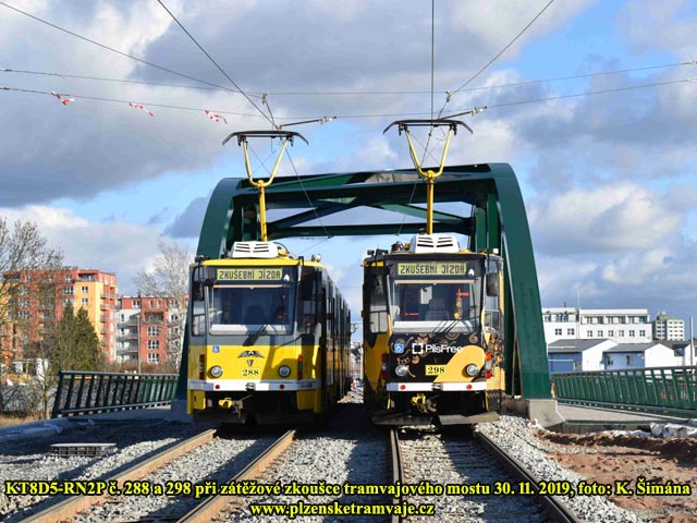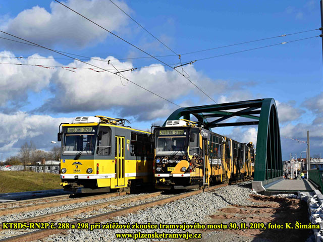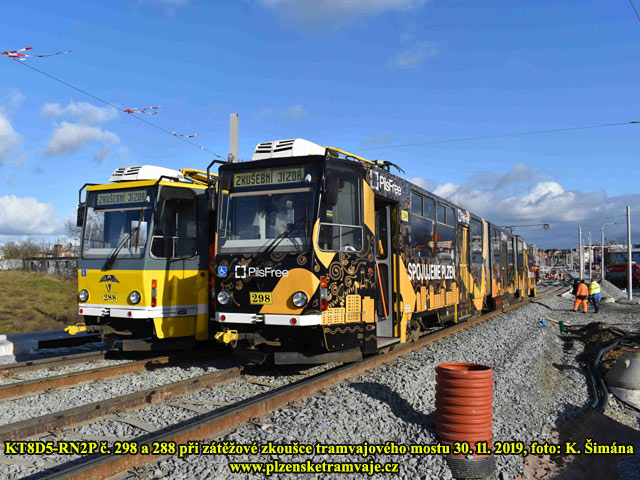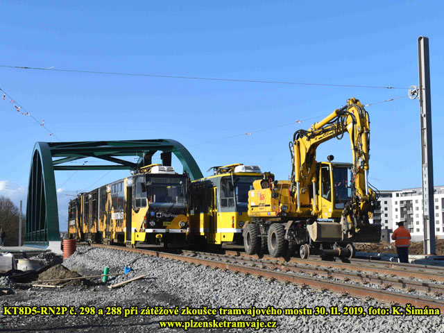 30. 11. 2019 30. 11. 2019 V sobotu 30. 11. 2019 proběhla již zmiňovaná zátěžová zkouška tramvajového mostu. Zůčastnily se jí vozy KT8D5-RN2P č. 288 a 298. Protože od Klatovské třídy k mostu ještě není nainstalované trolejové vedení, byly sem vozy postupně sunuty dvoucestným bagrem.