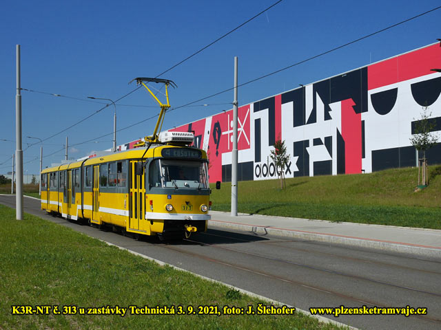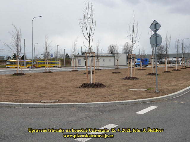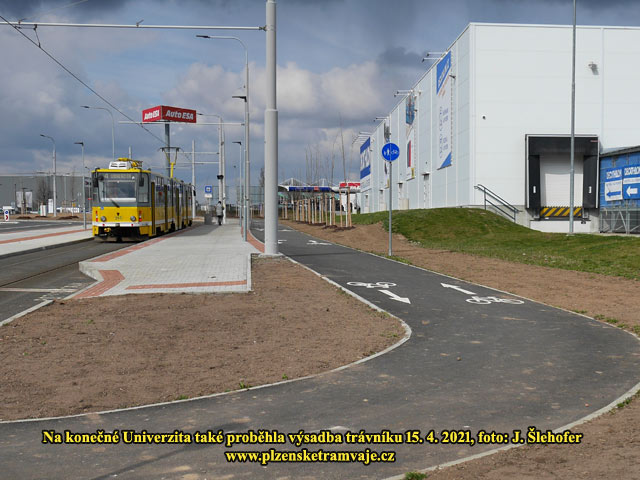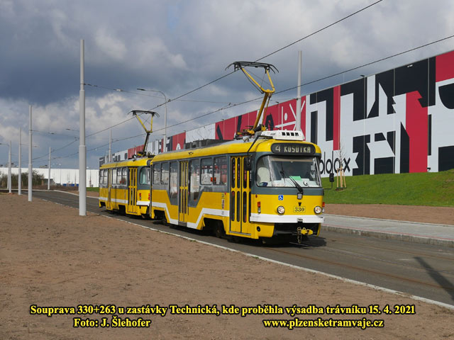Souprava 330+263 u zastávky Technická 15. 4. 2021 K3R-NT č. 314 v zastávce Technická 15. 4. 2021 KT8D5-RN2P č. 295 na konečné Univerzite, kde proběhlo vysetí trávníků  15. 4. 2021 Výsadba trávníků 15. 4. 2021