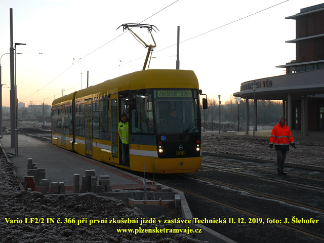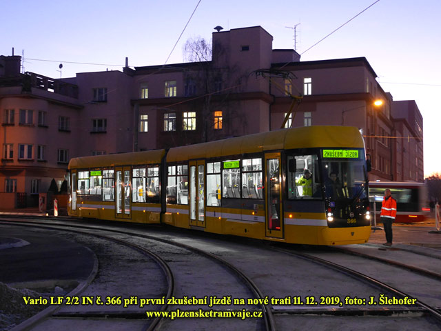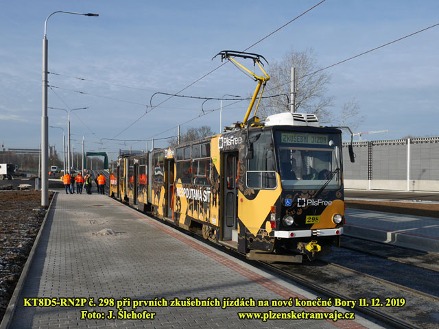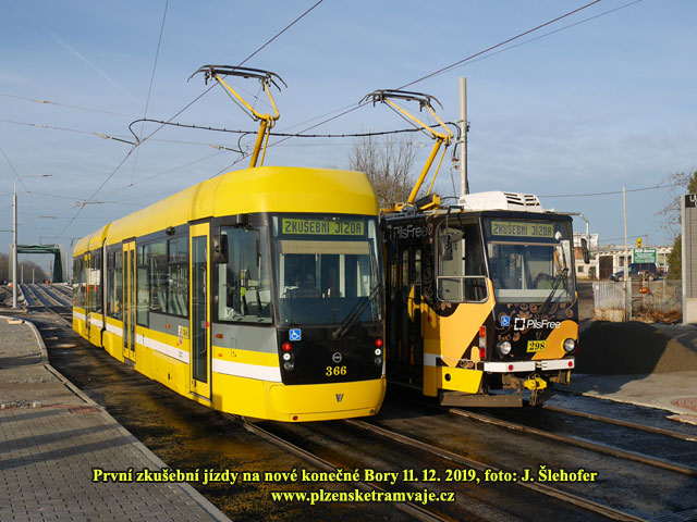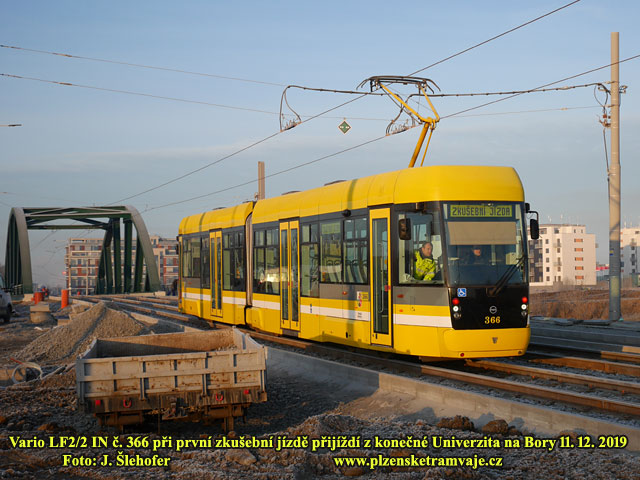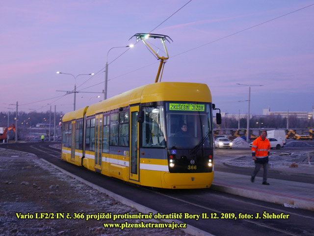 11. 12. 2019 11. 12. 2019 Ve středu 11. 12. 2019, krátce po sedmé hodině ráno, vyjíždí na novou trať první zkušební vozy. Protože je u zastávky Dvořákova nainstalován "kaliforňan" pro provoz linky č. 3, dostanou se sem přez něj tramvaje pouze po protisměrné koleji. Na zkušební jízdu tak vyjíždějí obousměrné vozy (Vario LF2/2 IN č. 366 a KT8D5-RN2P č. 298), aby se protisměrným průjezdem nového obratiště Bory dostaly na správnou kolej a následně mohly z druhého stanoviště projet trať ve správném směru.