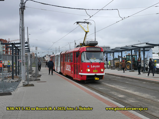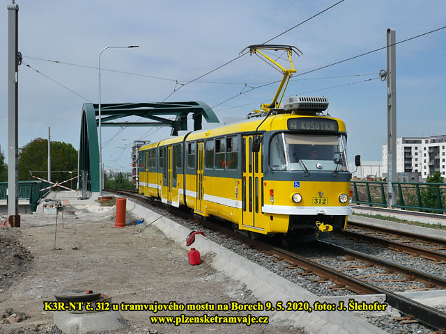 K3R-NT č. 312 u tramvajového mostu na Borech 9. 5. 2020 18. 5. 2020 Za přestupním uzlem Bory, směrem k tramvajovému mostu, je v polovině května 2020 budován také druhý chodník.