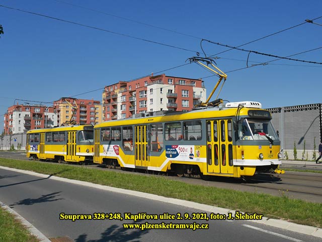 Souprava 328+248, Kaplířova ulice, 2. 9. 2021 Souprava 332-281 mezi zastávkami Bory a Technická 3. 9. 2021 KT8D5-RN2P č. 298 mezi zastávkami Technická a Bory 3. 9. 2021 K3R-NT č. 313 u zastávky Technická 3. 9. 2021