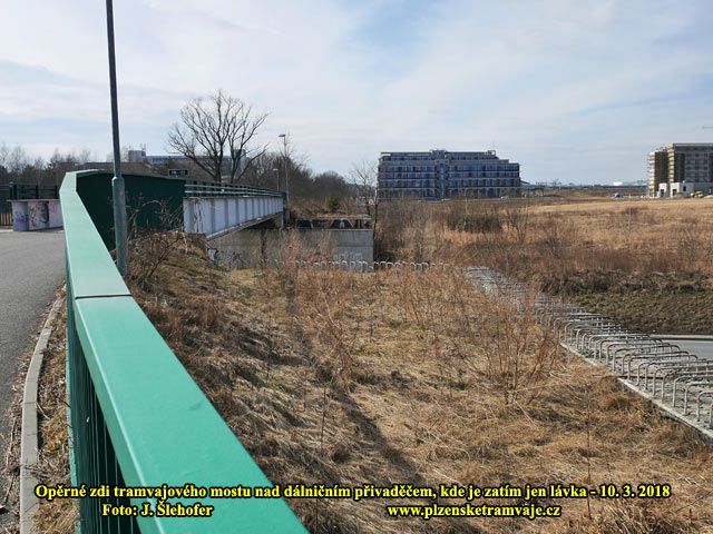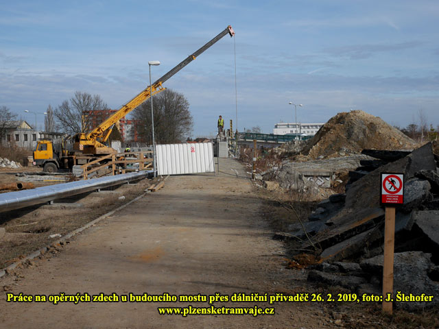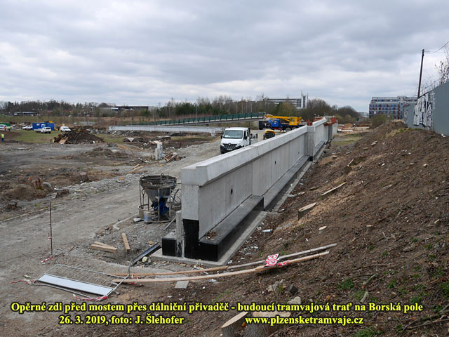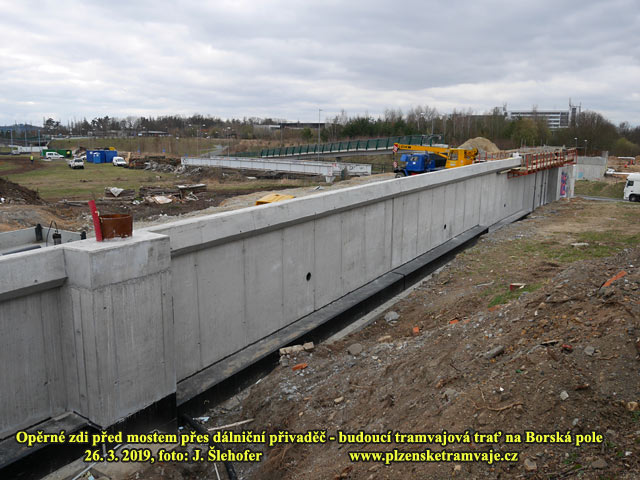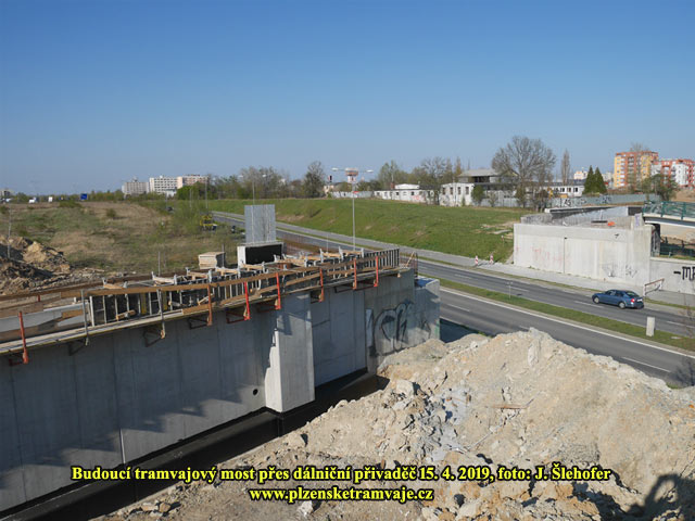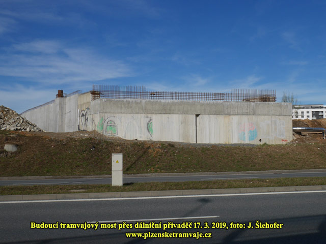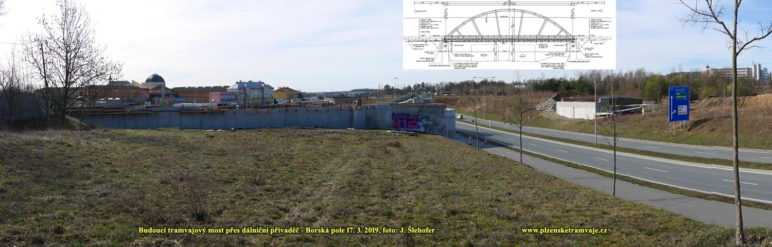Budoucí tramvajový most 17. 3. 2019 Budoucí tramvajový most 17. 3. 2019 Postupně také vyrostly další betonové zdi na okrajích budoucího tramvajového mostu přes dálniční přivaděč. Zejména na straně od Bor, jak je patrné na širokém snímku vpravo, kde je pro lepší představu přidán nákres budoucího mostu.