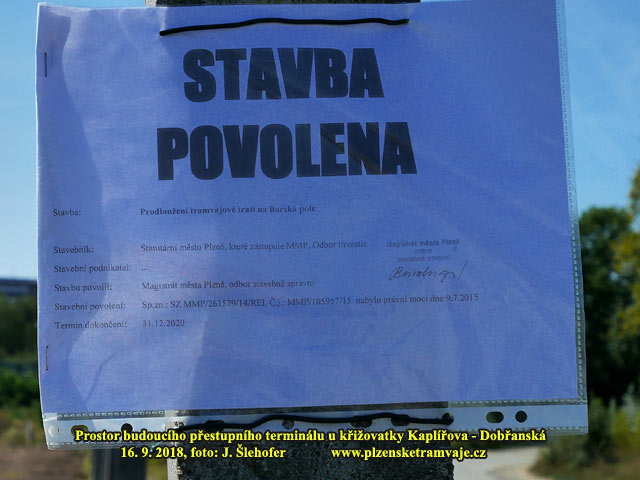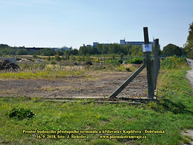 16. 9. 2018 16. 9. 2018 První náznaky dění v prostoru budoucího terminálu u křižovatky Kaplířova - Dobřanská se zřejmě objevily 13. 9. 2018, kdy zde probíhaly drobné terénní úpravy. Na místě se objevila také cedulka s informací o povolené stavbě.