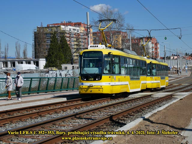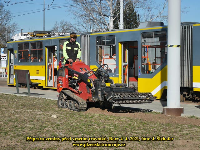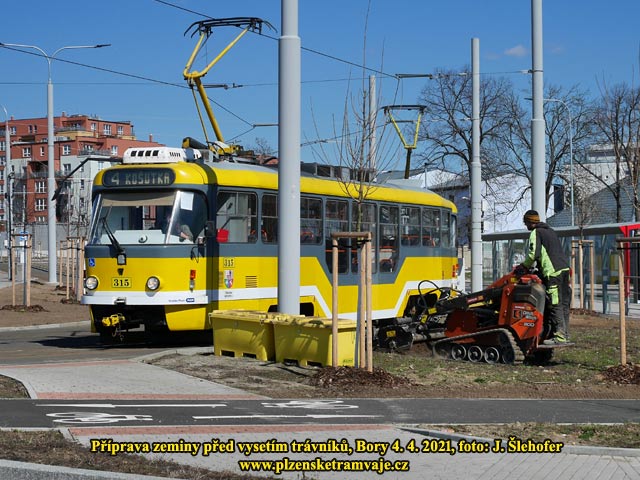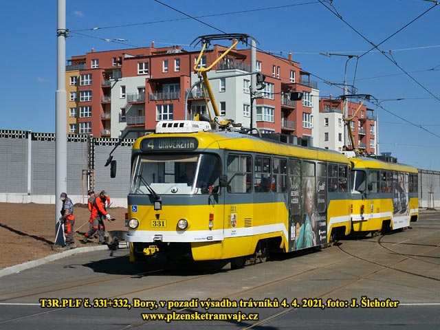 Souprava T3R.PLF 331+332 na Borech, v pozadí probíhá výsadba trávníků 4. 4. 2021 Výsadba trávníků 4. 4. 2021 Výsadba trávníků 4. 4. 2021 Souprava 352+353 na Borech, výsadba trávníků 4. 4. 2021