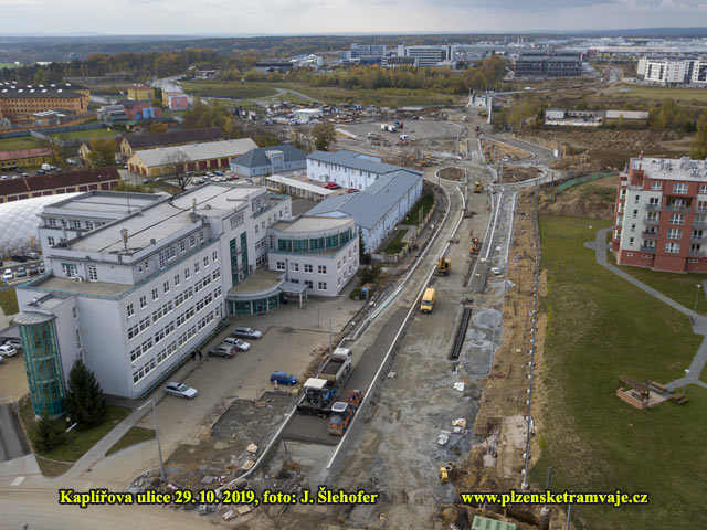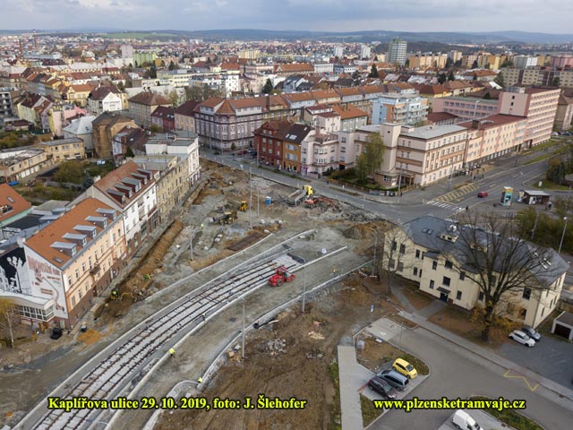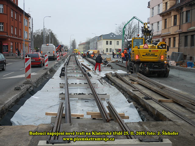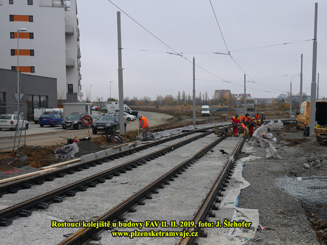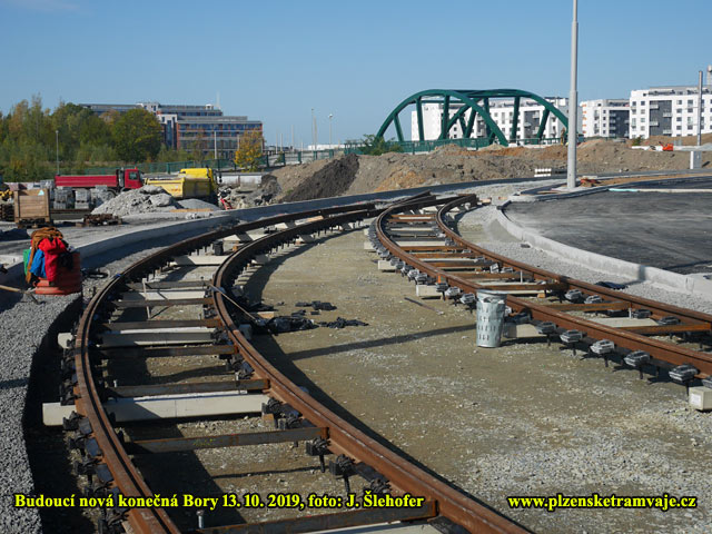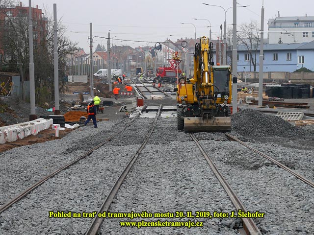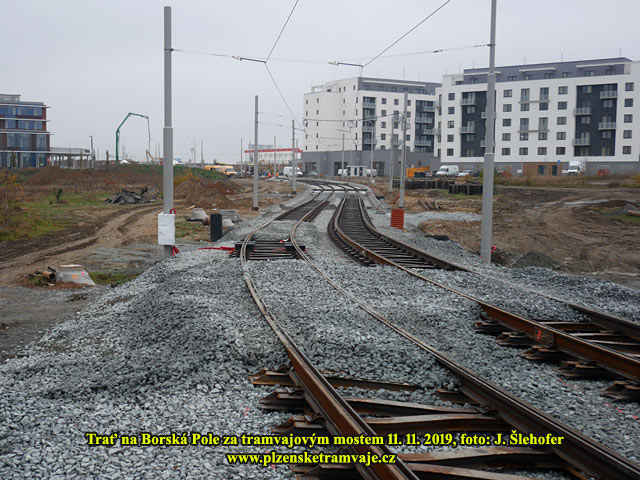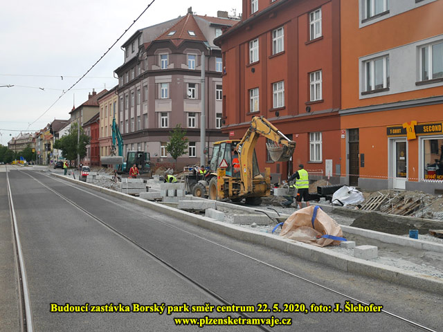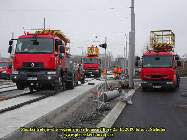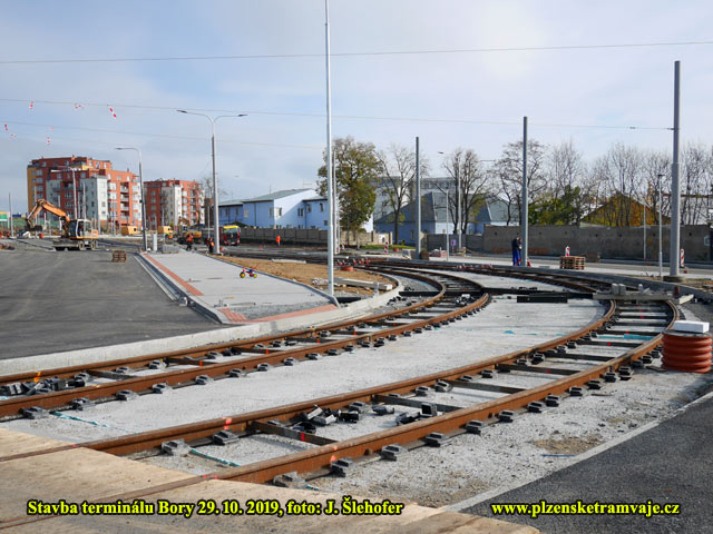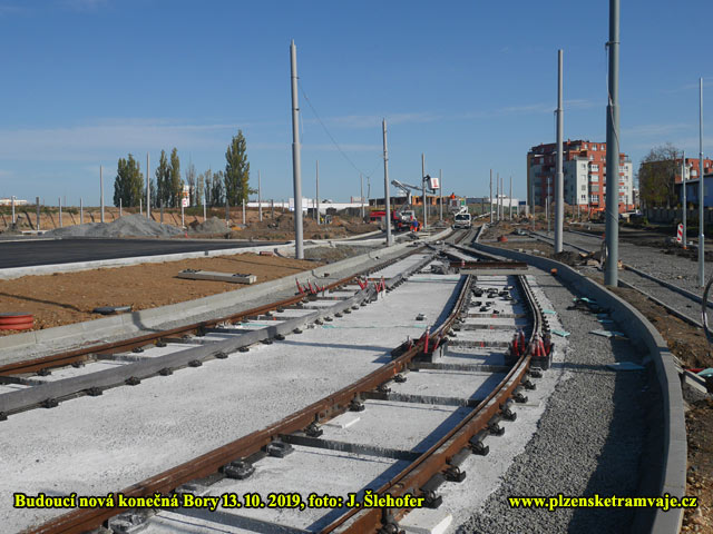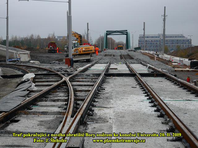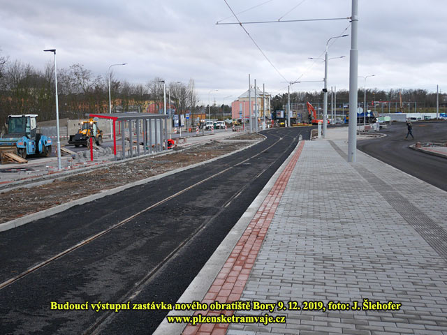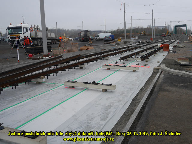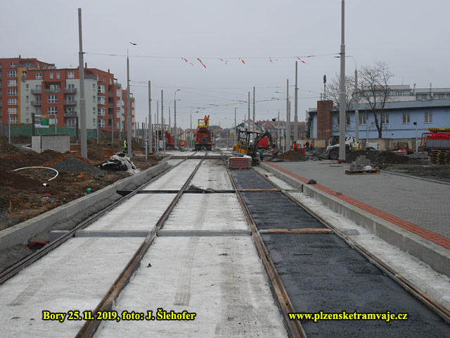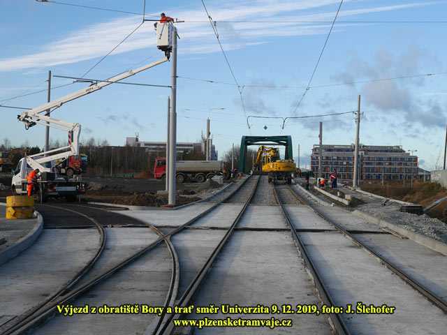 9. 12. 2019 9. 12. 2019 Začátkem prosince je trať již kompletní a bylo nataženo trolejové vedení také v Kaplířově ulici. Na Klatovské se buduje nástupiště nové zastávky Borský Park. Zatím však pouze ve směru na Bory. Ve směru do centra bude postaveno až na jaře.