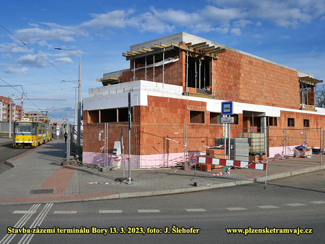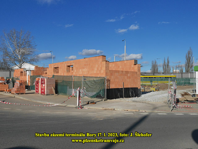 Stavba zázemí terminálu Bory 17. 1. 2023 Na stavbě se tak pokračuje i přes zimu. Postupně se objevují betonové základy a později již rostou cihlové budovy do výšky. Snímky zachycují postupný stav v lednu až březnu 2023.