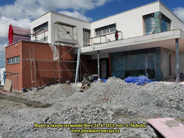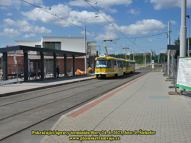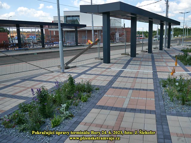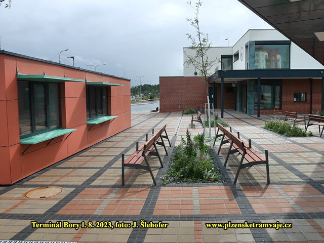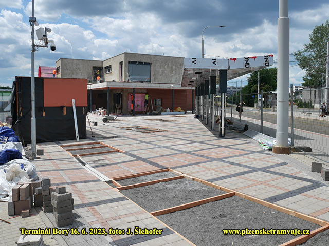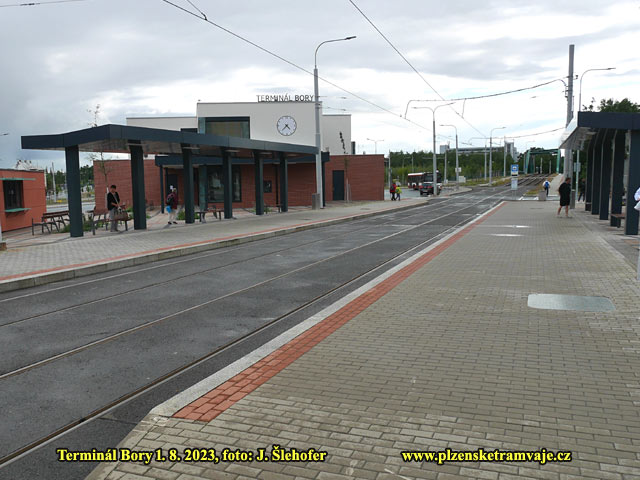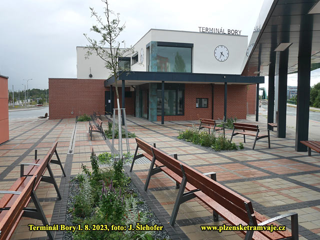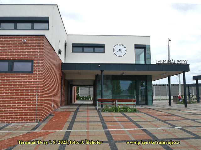 Bory 29. 6. 2023 Poslední práce jsou dokončované během července 2023. Na budově jsou např. troje hodiny směřující na různé strany a přibyly i nápisy TERMINÁL BORY. Celý prostor je po odklizení plotů přístupný od 1. 8. 2023, avšak vnitřní prostory jsou zatím prázdné. Místo hlídá také kamerový systém, tak doufejme, že zde nebude rychle docházet k nějakému vandalismu.