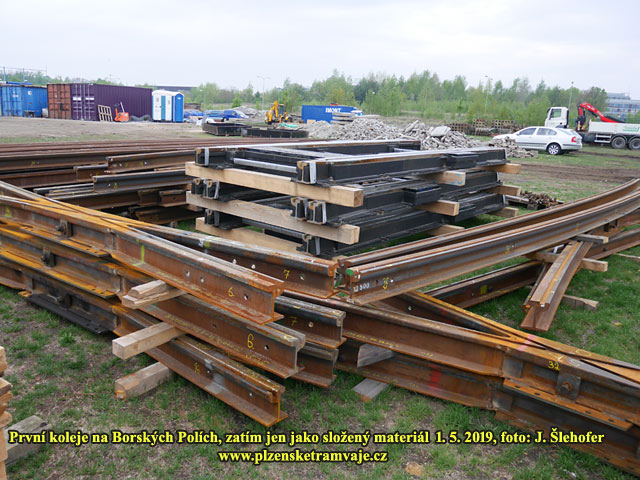 První koleje na Borský Polích - zatím jen jako materiál 1. 5. 2019 První koleje na Borský Polích - zatím jen jako materiál 1. 5. 2019 Začátkem května 2019 se na Borských Polích objevují již první kolejnice. Zatím však pouze jako složený materiál. Na místě jsou již také další části kolejových konstrukcí, tedy výhybky a křížení.