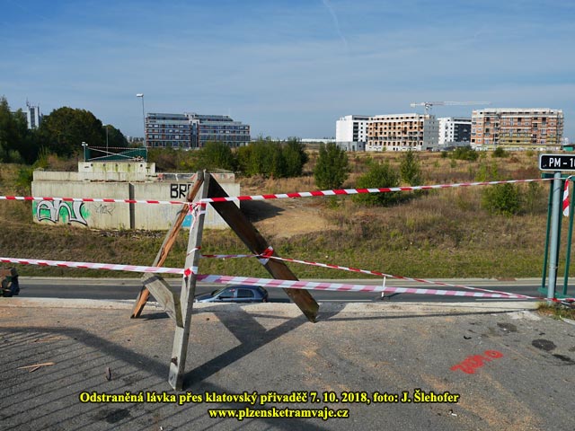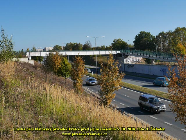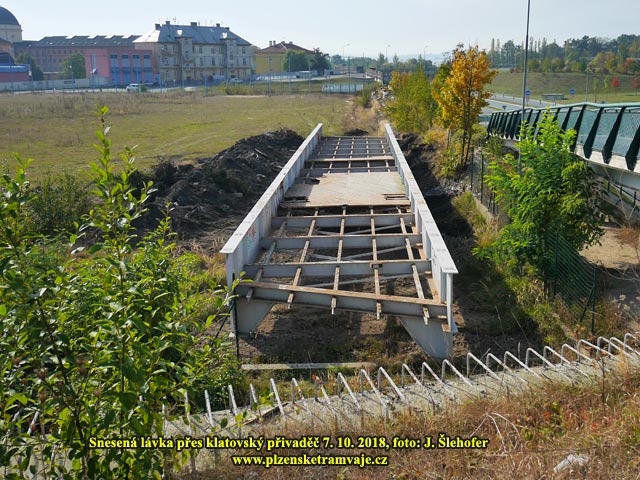 Lávka přes klatovský přivaděř krátce před jejím snesením 5. 10. 2018 Již odstraněná lávka přes klatovský přivaděč 7. 10. 2018 Již odstraněná lávka přes klatovský přivaděč 7. 10. 2018 Snesená lávka přes klatovský přivaděč ležící nedaleko přivaděče 7. 10. 2018