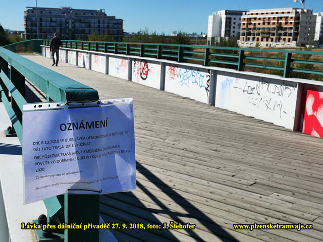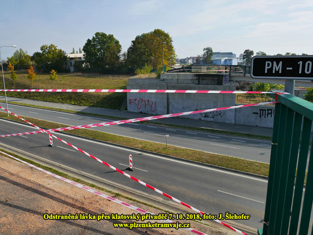 Lávka přes dálniční přivaděč krátce před snesením 27. 9. 2018 V sobotu 6. 10. 2018 byla snesena lávka přes dálniční přivaděč. Byla zde dočasně usazena na podpěrách pro tramvajový most. Podpěry byly postavné již v roce 2010 jako součást dálničního přivaděče. V budoucnu se zde stezka pro pěší na novém tramvajovém mostě opět objeví, ale to potrvá.