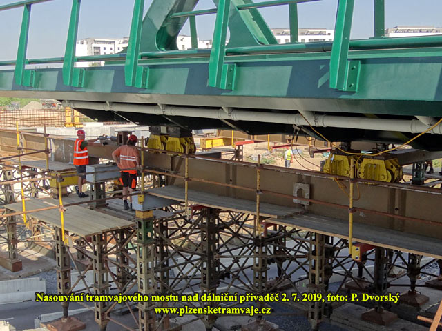8. 7. 2019 8. 7. 2019 Začátkem druhého červencového týdne je pak pod mostem rozebrána posuvná dráha. Oproti poloze na těchto snímcích most ještě mírně klesne a bude usazen na definitivní ložiska.