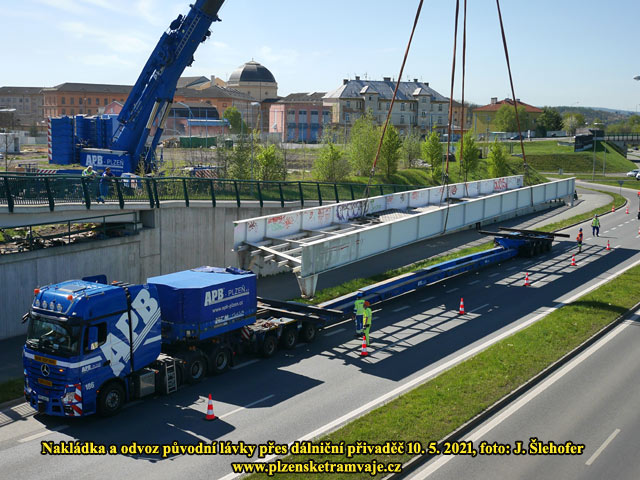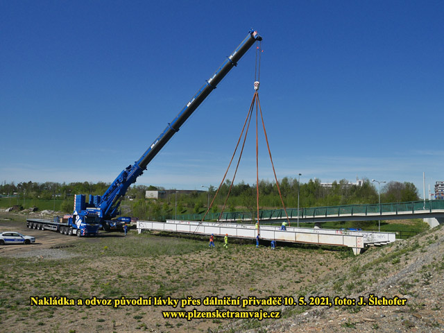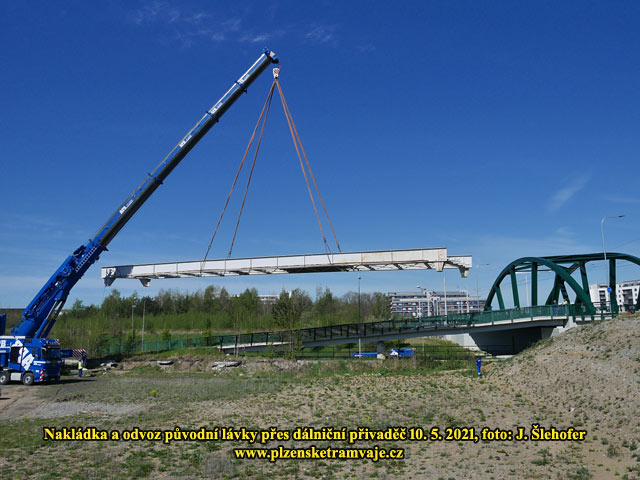 Odvoz původní lávky přes dálniční přivaděč 10. 5. 2021 10. 5. 2021 byla čtyřicetimetrová lávka pomocí velkého jeřábu naložena na dlouhý podvalník stojící na dálničním přivaděči u tramvajového mostu. Dopravce APB ji následně odvezl k tunelu Valík, kde zatím čeká na další využití.