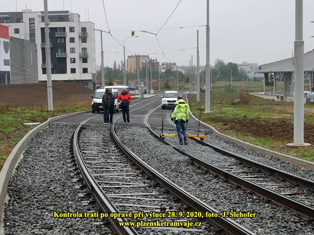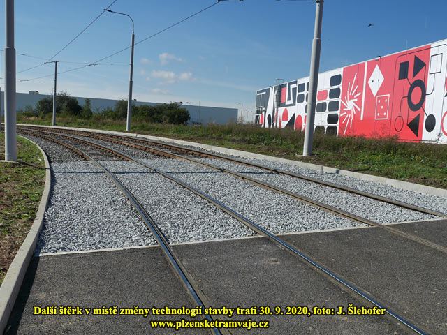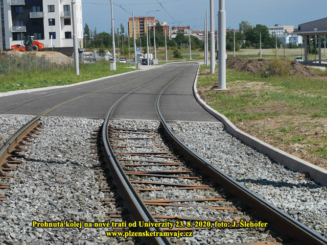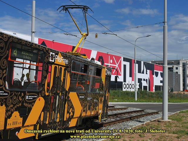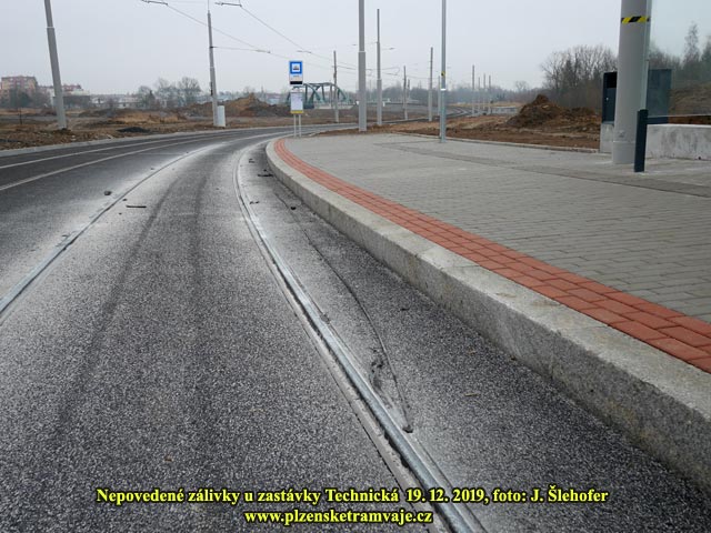 Místo s omezenou rychlostí nedaleko zastávky Technická 23. 8. 2020 Místo s omezenou rychlostí nedaleko zastávky Technická 23. 8. 2020 V druhé půlce srpna 2020 se nám také objevila první vada na nové trati. V místě styku různých technologií stavby kolejiště v oblouku před zastávkou Technická směrem do centra, došlo k vybočení kolejí a byla zde omezena rychlost na 20 km/hod. Patrně kolejiště v předcházejímí oblouku, které je uloženo na pražcích, se vlivem horka roztáhlo a zarazilo se o navazující úsek tvořený pevnou jízdní dráhou (zabetonované kolejiště) a tedy zde se vyboulilo. Tramvaje zde mírně začaly škubat již začátkem léta, ale situace se pak zhoršila cca po polovině srpna.