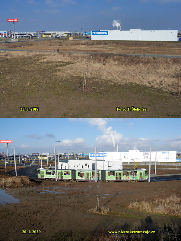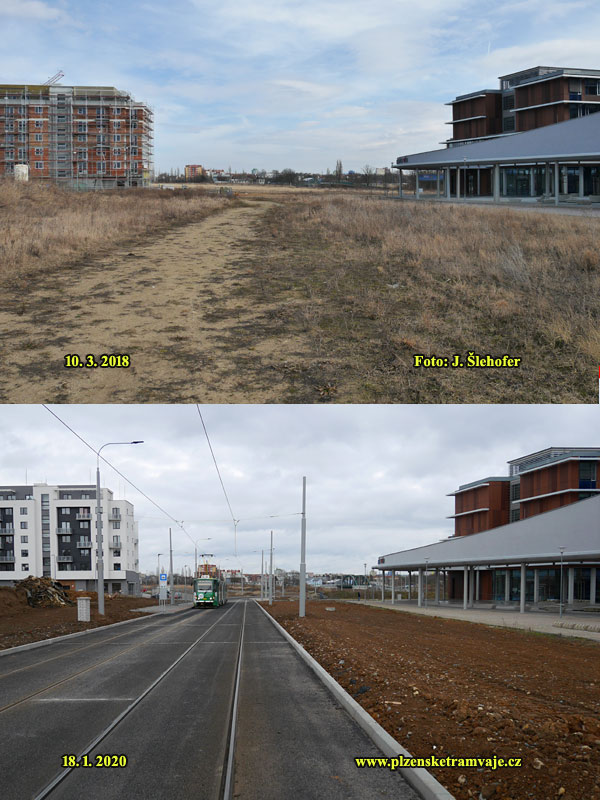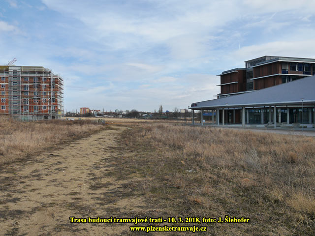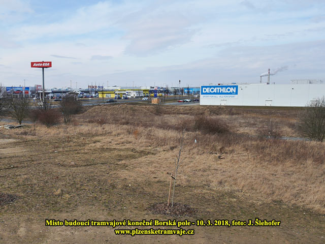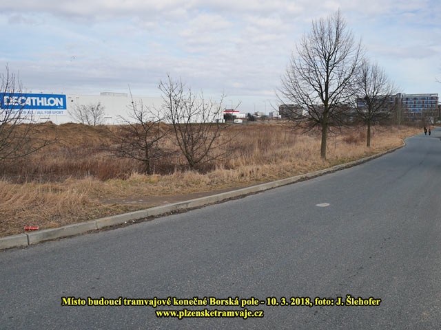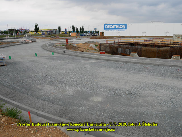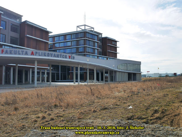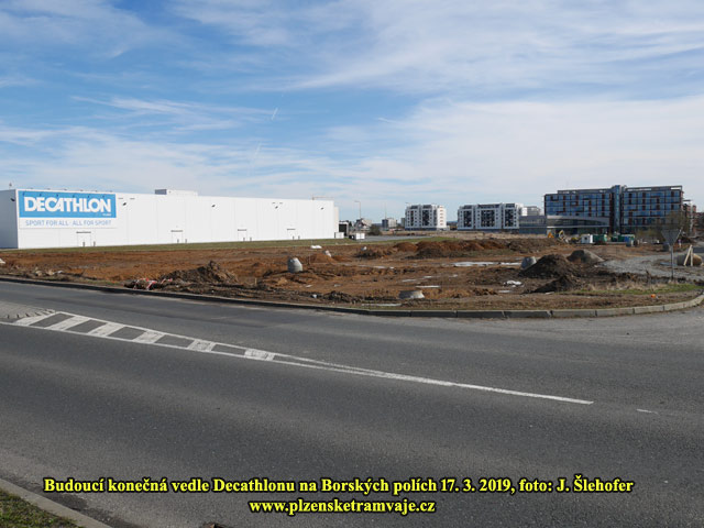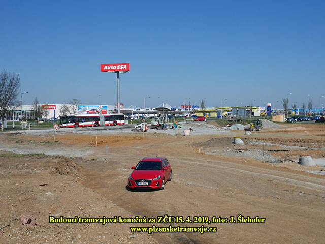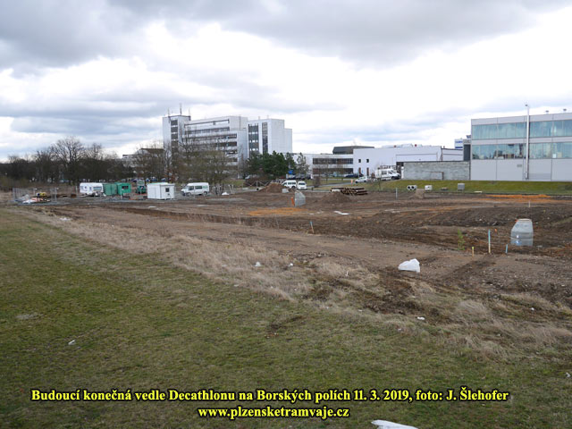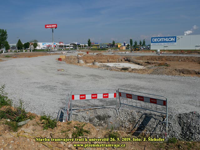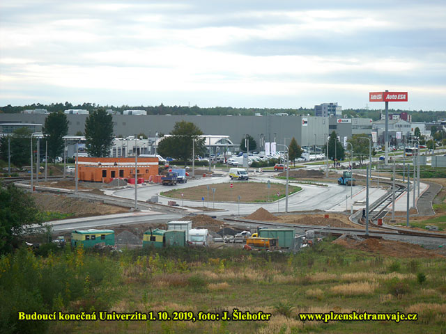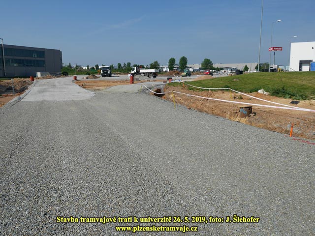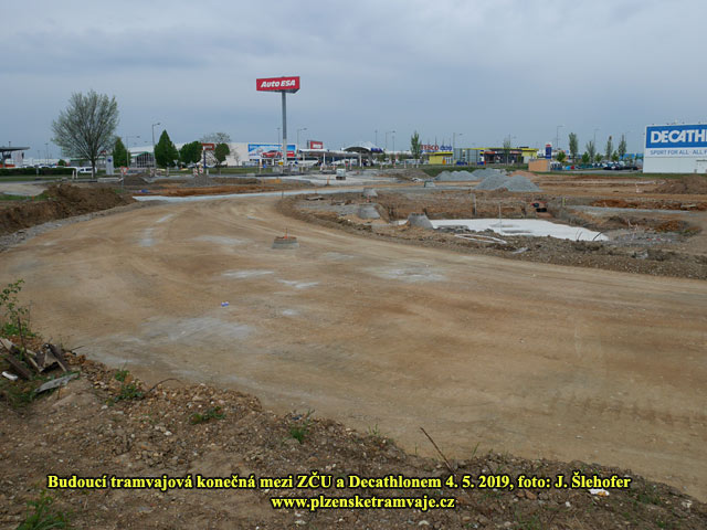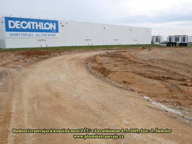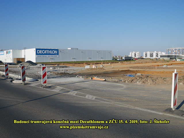 Budoucí tramvajová konečná mezi ZČU a Decathlonem 4. 5. 2019 Budoucí tramvajová konečná mezi ZČU a Decathlonem 4. 5. 2019 Koridor trati začíná být také patrný v prostrou druhého tramvajového obratiště, tedy konečné mezi ZČU a Decathlonem. V prostoru na snímku vpravo pak budu ve smyčce dvě koleje.