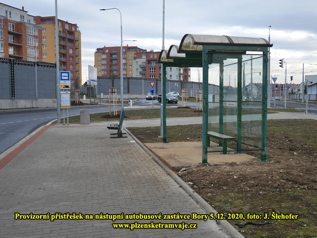 Terminál Bory Dočasný přístřešek na konečné Bory 5. 12. 2020 Ačkoliv tramvaje po nové trati jezdí již rok, některé věci na místě stále nejsou ideální. Sice je terminál Bory již v provozu, ale dosud zde chybí definitivní zázemí pro řidiče i pro cestující. Řidiči zde mají provizorní buňku a cestující v prosinci 2020 dostaly k dispozici alespoň dočasně přístřešek na nástupní autobusové zastávce. Definitivní zázemí a zastřešení tramvajových zastávek by mělo být zvláštní stavbou, která bude však realizována patrně až v roce 2022. :(