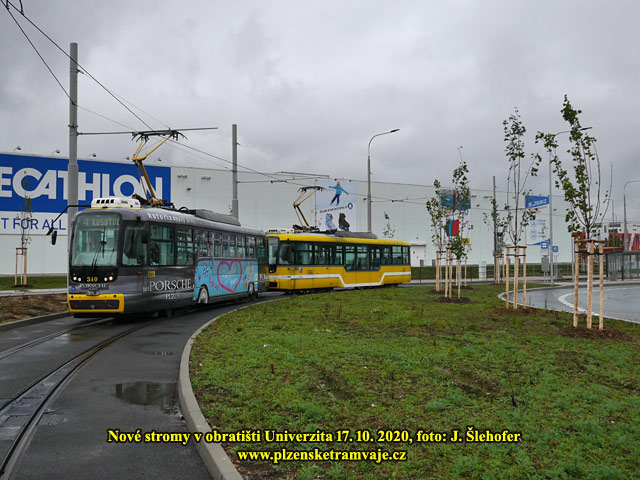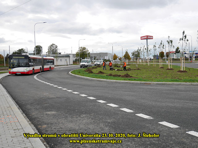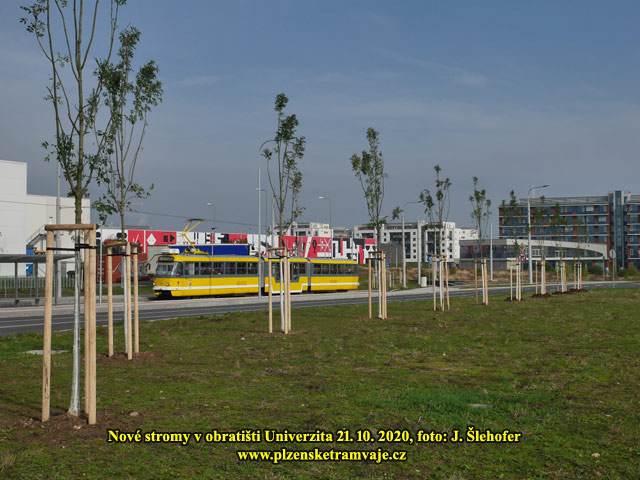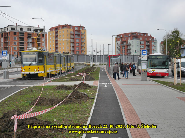 Vysázené stromu u Decathlonu 17. 10. 2020 V druhé polovině října se rozbíhá výsadba stromů. Jedná se o součást stavby prodloužení tramvajové trati na Borská pole a vlastně také o náhradu vykácených stromů. První se objevují v obratišti Univerzita a postupně také u konečné Bory. Stromy přibydou v některých místech i podél Kaplířovy ulice, u parkoviště u křižovatky Klatovská - Kaplířova a pár se jich objeví i uprostřed kruhového objezdu.