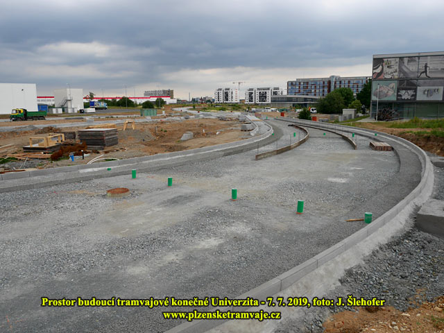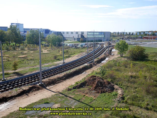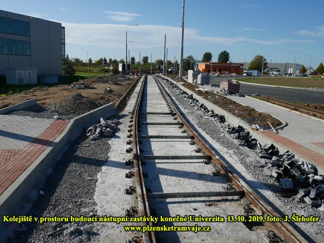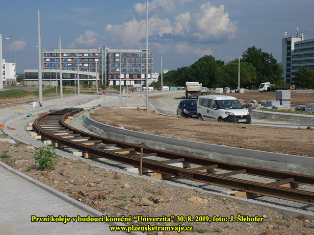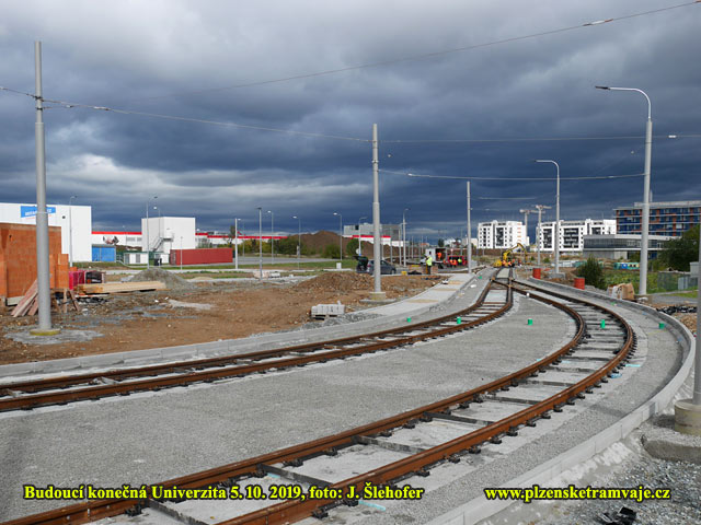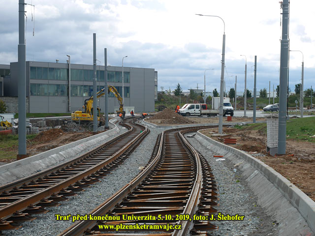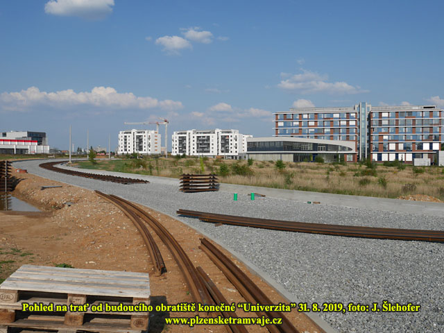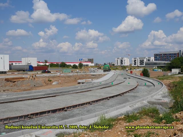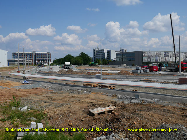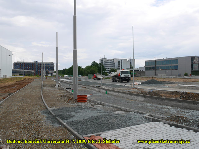 První sloupy na budoucí konečné Univerzita 14. 7. 2019  Budoucí konečná Univerzita 15. 7. 2019  Budoucí konečná Univerzita 15. 7. 2019 Budoucí trať před konečnou Univerzita 17. 7. 2019