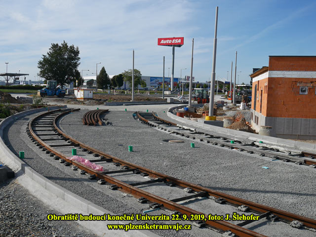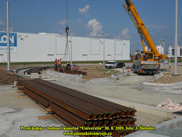 30. 8. 2019 30. 8. 2019 Koncem srpna se objevují první koleje na Borských polích. Konkrétně v budoucím obratišti konečné Univerzita ležícím vedle Dacathlonu je to rozjízdná výhybka a navazující oblouk kolejí ve splítce.