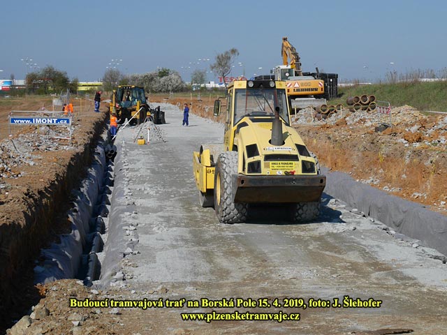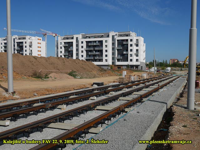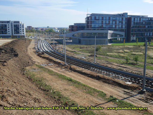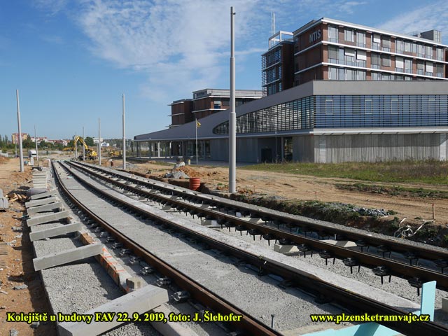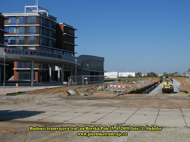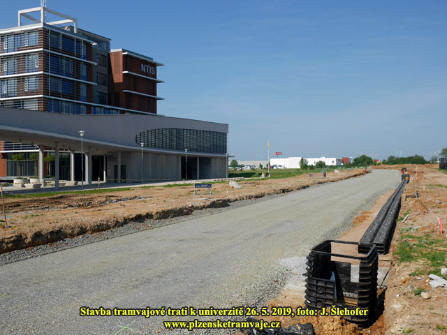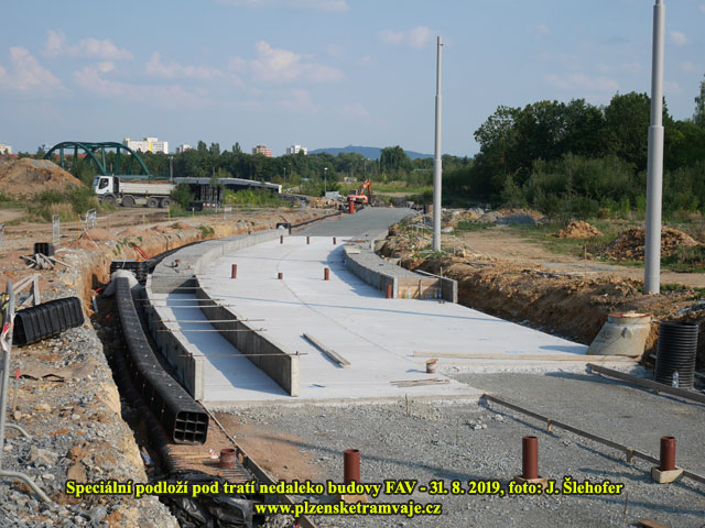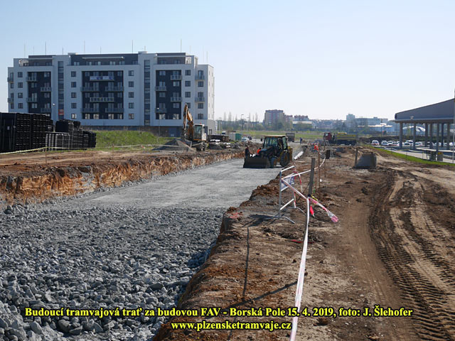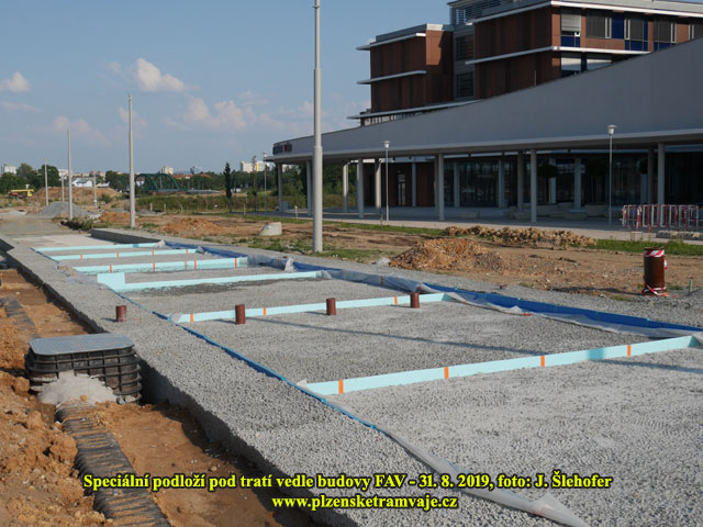 15. 4. 2019 Nejdále v realizaci trati je úsek za budovou FAV, kde jsou v polovině dubna 2019 již pokládány vrstvy podloží a také odvodňovací drenáže. V tomto úseku tak patrně uvidíme nejdříve první koleje.