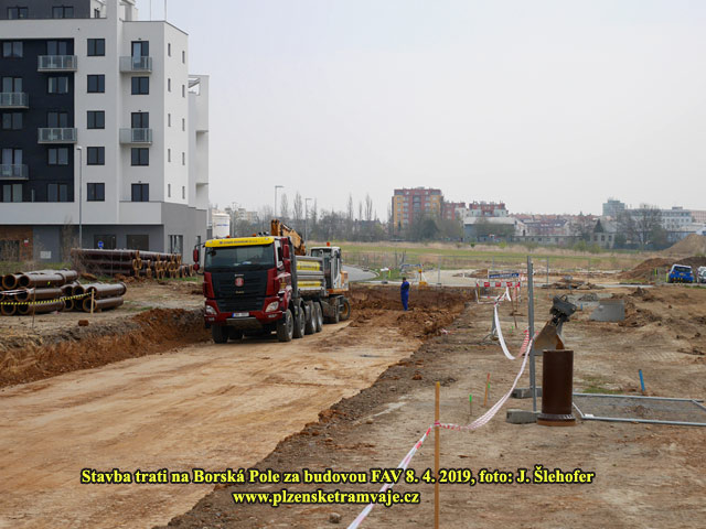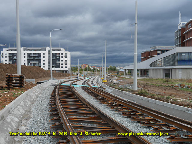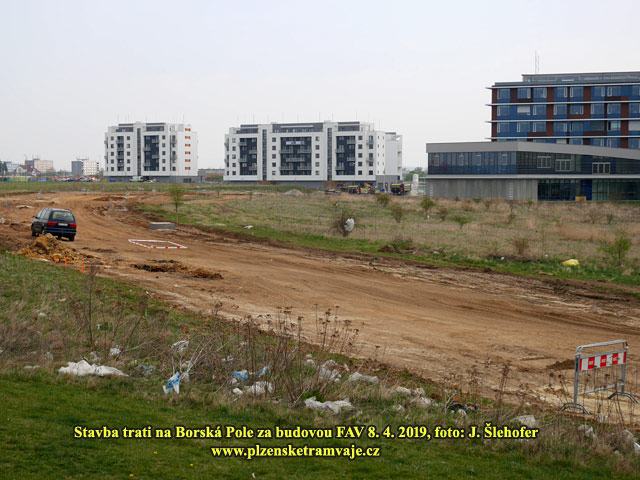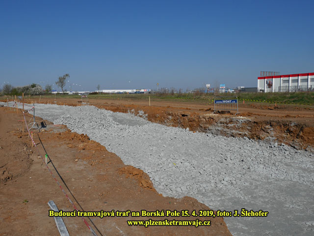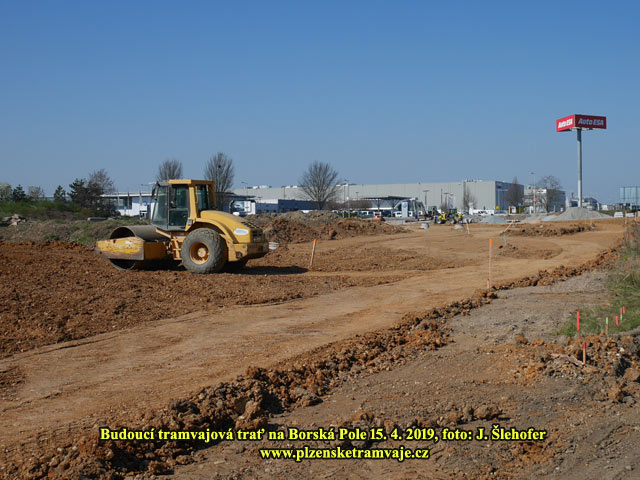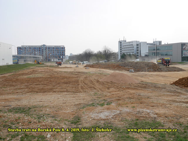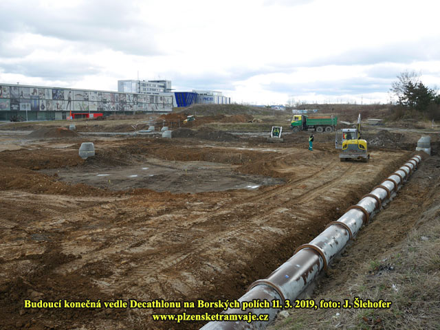 8. 4. 2019 Za budovou FAVky je již v místě trati vybagrována zemina, aby se mohlo upravit podloží. Po obou stranách buducí trati jsou již patky pro sloupy trolejového vedení a jak už zaznělo, podél jde také kanalizace. V následujícím úseku směrem k Decathlonu půjde trať mírně vzhůru a tak již není potřeba koridor bagrovat. Naopak zde bude podloží navezeno. Právě i konečná vedle Decathlonu bude položena výše, než byl původní terén. Bude ve stejné výšce jako Podnikatelská ulice a tak je původní níže položený prostor již zavážen zeminou právě z jiných míst stavby.