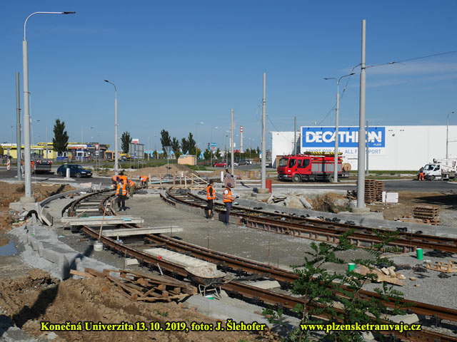 Pracuje se samozřejmě i na dalších místech. Např. na konečné Bory probíhá montáž trolejového vedení. Dále také napojování jednoho z posledních úseků před tramvajovým mostem, či v křižovatce před Úřadem práce. Také se konečně objevuje nástupiště nástupní zastávky na konečné Univerizita.