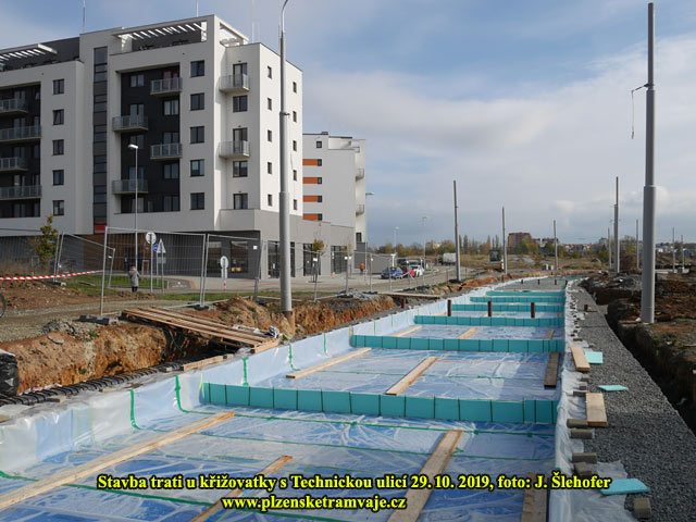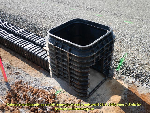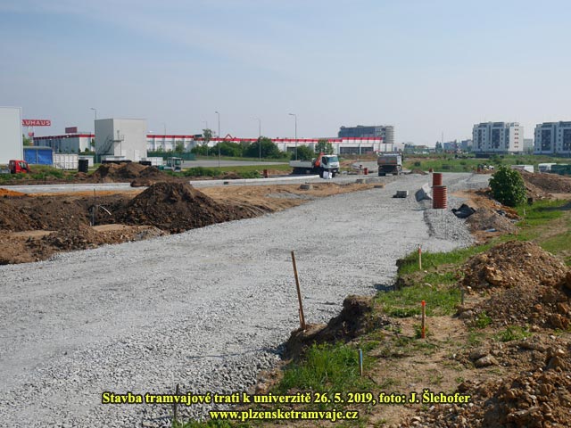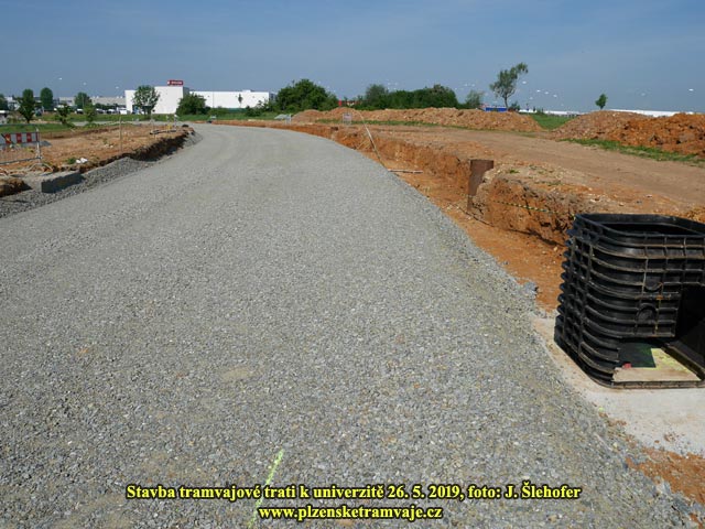 26. 5. 2019 26. 5. 2019 Další série snímků pochází z 26. 5. 2019. Zachycuje připravené podloží v úseku od Technické ulice po konečnou Univerzita. Připraveny jsou patky sloupů, odvodnění, připravují se kabelové trasy, pomocí plastových multikanálů.