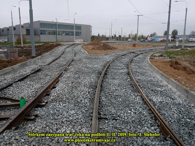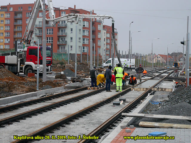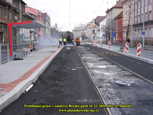 9. 12. 2019 9. 12. 2019 Zbývají dokončit některé povrchy. Pracuje se na chodnících, ale i na zakrytí tramvajové trati. Tam kde je pevná jízdní dráha, tedy z Klatovské, v Kaplířově, stejně jako v obratišti Bory, kolem zastávky Technická a v obratišti Univerzita, je použit litý asfalt zasypaný jemným štěrkem.