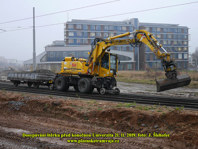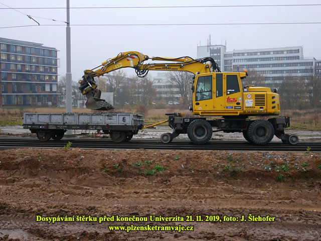 21. 11. 2019 21. 11. 2019 Po tramvajové trati se již prohání různé pracovní stroje. Kromě vozidel pracovníků horního vedení s kolejovým adaptérem a výše uvedené podbíječky jsou to také bagry s kolejovými adaptéry a zde na snímku jeden i s vagónem na štěrk při dosypávání štěrku před konečnou Univerzita.