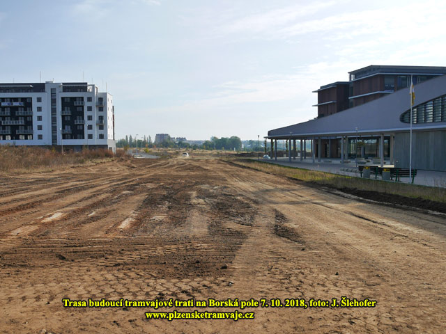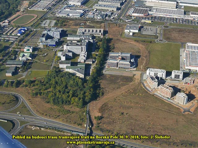 Borská Pole 30. 9. 2018 Na leteckém snímku z 30. 9. 2018 je již patrná trasa budoucí tramvajové trati. Příliš teréních úprav sice ještě na místě neproběhlo, ale nějaká technika se již v trase pohybovala a tak koridor je již patrný.